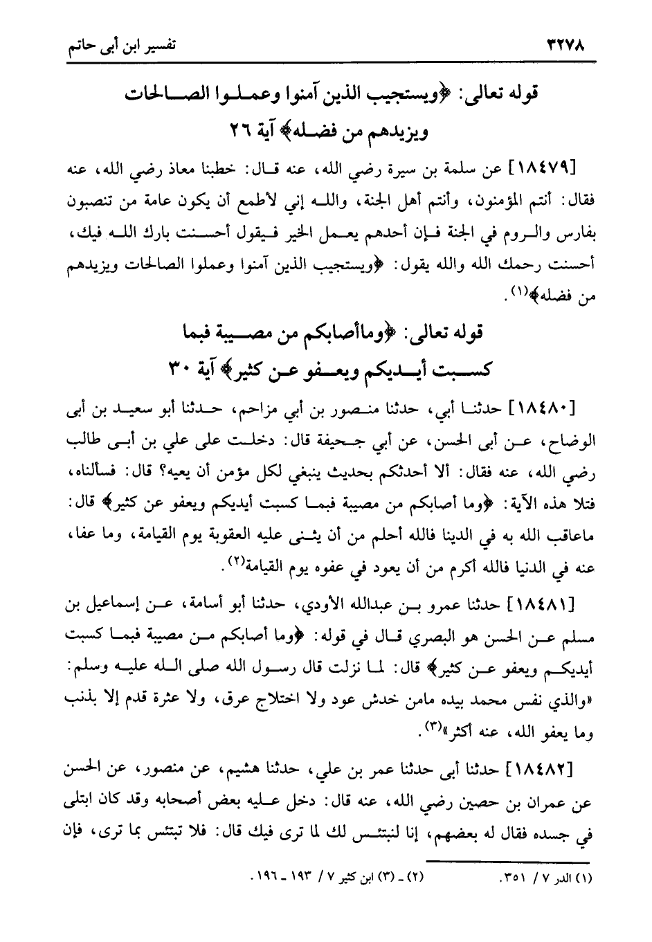 18480 - حَدَّثَنَا أَبِي، حَدَّثَنَا مَنْصُورُ بْنُ أَبِي مُزَاحِمَ، حَدَّثَنَا أَبُو سَعِيدِ بْنُ أَبِي الْوَضَّاحِ، عَنْ أَبِي الْحَسَنِ، عَنْ أَبِي جُحَيْفَةَ قَالَ: دَخَلْتُ عَلَى عَلِيِّ بْنِ أَبِي طَالِبٍ رَضِيَ اللَّهُ، عَنْهُ فَقَالَ: أَلا أُحَدِّثَكُمْ بِحَدِيثٍ يَنْبَغِي لِكُلِّ مُؤْمِنٍ أَنْ يَعِيَهُ؟ قَالَ: فَسَأَلْنَاهُ، فَتَلا هَذِهِ الْآيَةَ: وَمَا أَصَابَكُمْ مِنْ مُصِيبَةٍ فَبِمَا كَسَبَتْ أيديكم ويعفوا عَنْ كَثِيرٍ قَالَ: