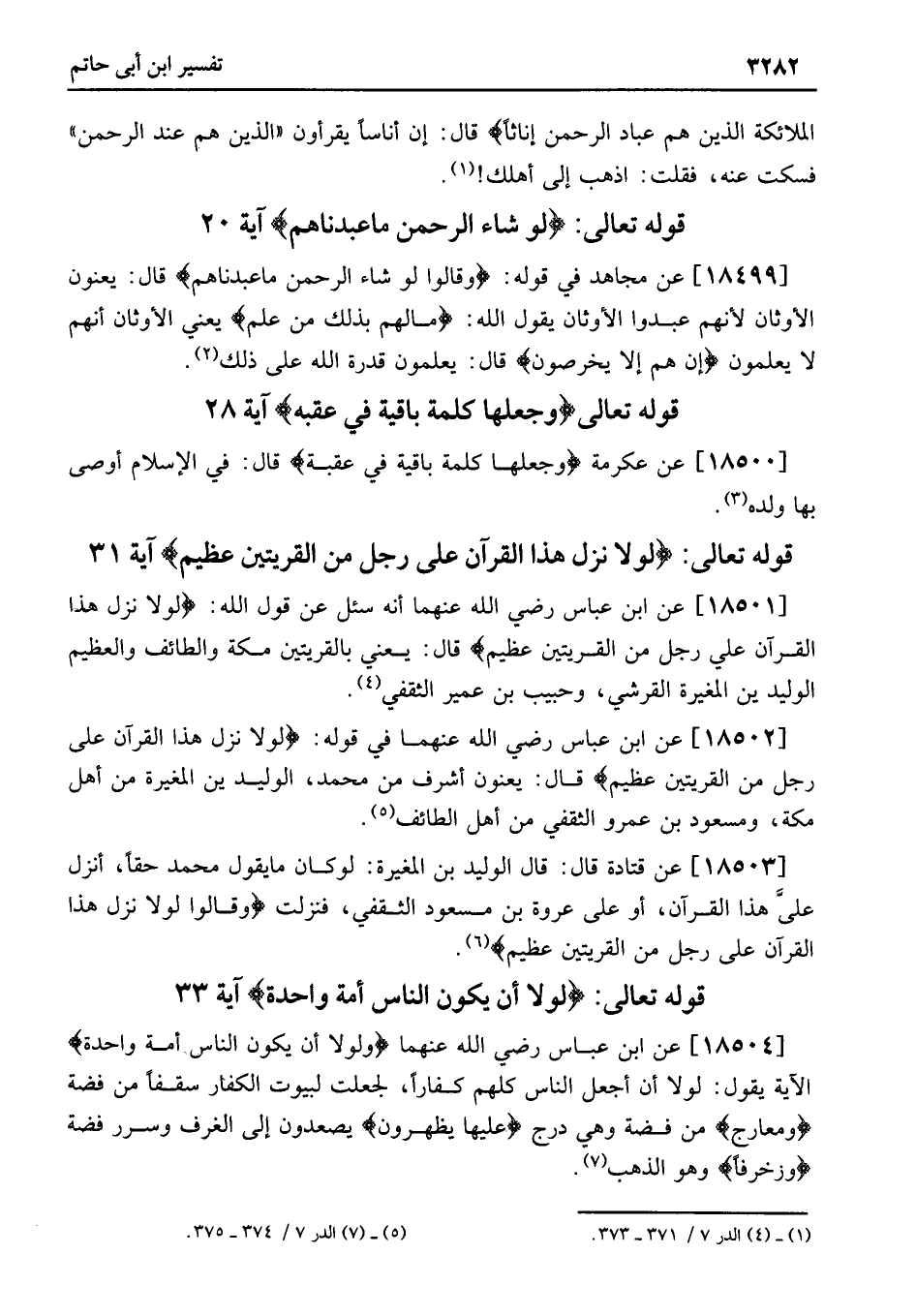 18502 - عَنِ ابْنِ عَبَّاسٍ رَضِيَ اللَّهُ عَنْهُمَا فِي قَوْلِهِ: لَوْلا نُزِّلَ هَذَا الْقُرْآنُ عَلَى رَجُلٍ مِنَ الْقَرْيَتَيْنِ عَظِيمٍ قَالَ: يَعْنُونَ أَشْرَفَ مِنْ مُحَمَّدٍ، الْوَلِيدَ بْنَ الْمُغِيرَةِ مِنْ أَهْلِ مَكَّةَ، وَمَسْعُودَ بْنَ عَمْرٍو الثَّقَفِيَّ مِنْ أَهْلِ الطَّائِفِ «5» .