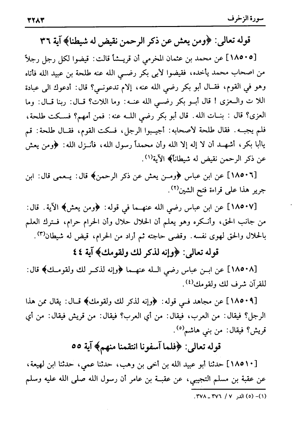 18505 - عَنْ مُحَمَّدِ بْنِ عُثْمَانَ الْمَخْرَمِيِّ أَنَّ قُرَيْشًا قَالَتْ: قَيِّضُوا لِكُلِّ رَجُلٍ رَجُلًا مِنْ أَصْحَابِ مُحَمَّدٍ يَأْخُذُهُ، فَقَيَّضُوا لِأَبِي بَكْرٍ رَضِيَ اللَّهُ عَنْهُ طَلْحَةَ بْنَ عُبَيْدِ اللَّهِ فأَتَاهُ وَهُوَ فِي الْقَوْمِ، فَقَالَ أَبُو بَكْرٍ رَضِيَ اللَّهُ عَنْهُ، إِلامَ تَدْعُونِي؟ قَالَ: أَدْعُوكَ إِلَى عِبَادَةِ اللاتِ وَالْعُزَّى! قَالَ أَبُو بَكْرٍ رَضِيَ اللَّهُ عَنْهُ: وَمَا اللاتُ؟ قَالَ: رَبُّنَا قَالَ: وَمَا الْعُزَّى؟ قَالَ: بَنَاتُ اللَّهِ. قَالَ أَبُو بَكْرٍ رَضِيَ اللَّهُ عَنْهُ: فَمَنْ أُمُّهُمْ؟ فَسَكَتَ طَلْحَةُ، فَلَمْ يُجِبْهُ. فَقَالَ طَلْحَةُ لِأَصْحَابِهِ: أَجِيبُوا الرَّجُلَ، فَسَكَتَ الْقَوْمُ، فَقَالَ طَلْحَةُ: قُمْ يَا أَبَا بَكْرٍ، أَشْهَدُ أَنْ لَا إِلَهَ إِلا اللَّهُ وَأَنَّ مُحَمَّداً رَسُولُ اللَّهِ، فَأَنْزَلَ اللَّهُ: وَمَنْ يَعْشُ عَنْ ذِكْرِ الرَّحْمَنِ نُقَيِّضْ لَهُ شَيْطَانًا الْآيَةَ «1» .
