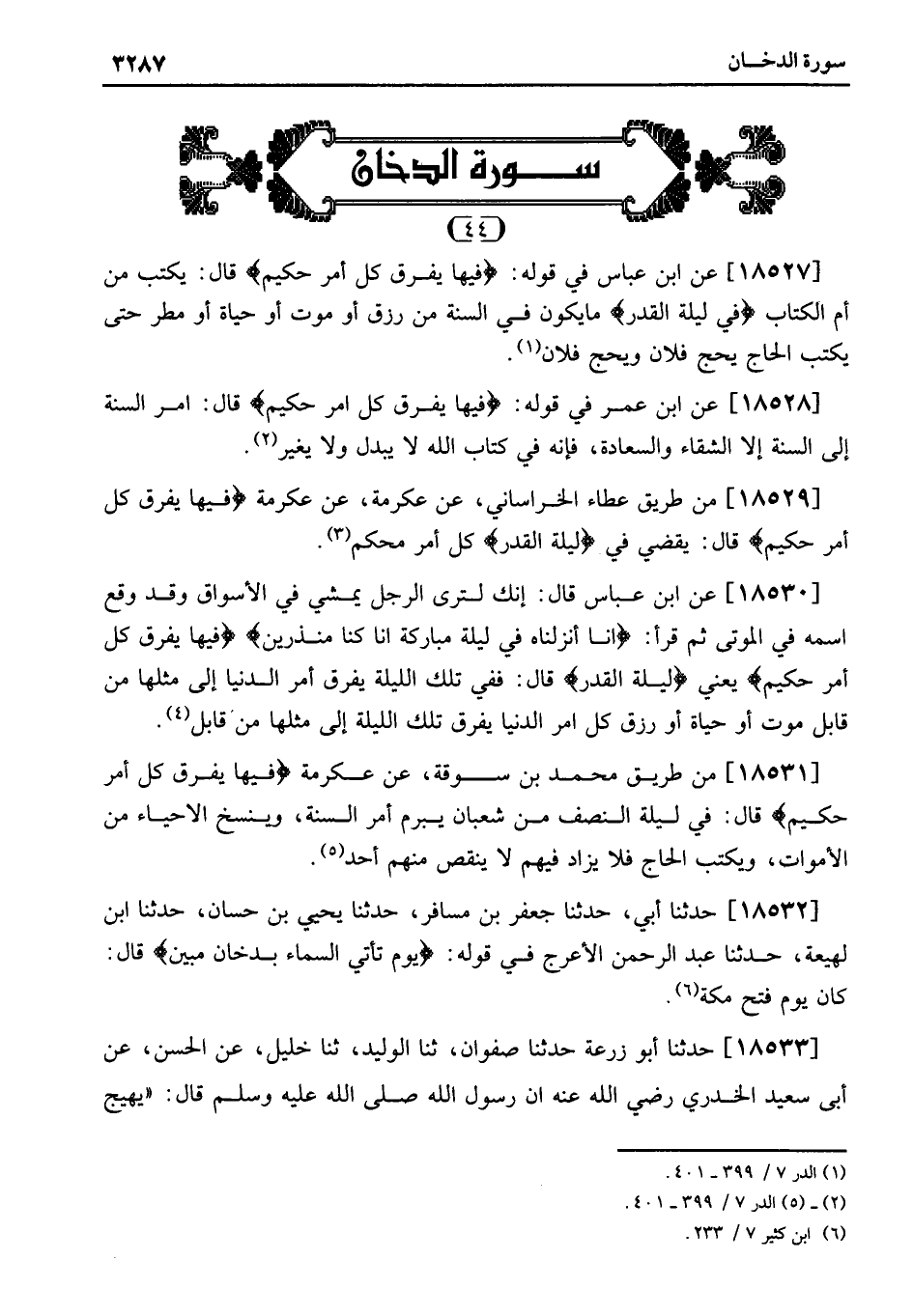 18527 - عَنِ ابْنِ عَبَّاسٍ فِي قَوْلِهِ: فِيهَا يُفْرَقُ كُلُّ أَمْرٍ حَكِيمٍ قَالَ: يُكْتَبُ مِنْ أُمِّ الْكِتَابِ فِي لَيْلَةِ الْقَدْرِ مَا يَكُونُ فِي السَّنَةِ مِنْ رِزْقٍ أَوْ مَوْتٍ أَوْ حَيَاةٍ أَوْ مَطَرٍ حَتَّى يُكْتَبَ الْحَاجُّ يَحِجُّ فُلانٌ وَيَحِجُّ فَلانٌ «1» .