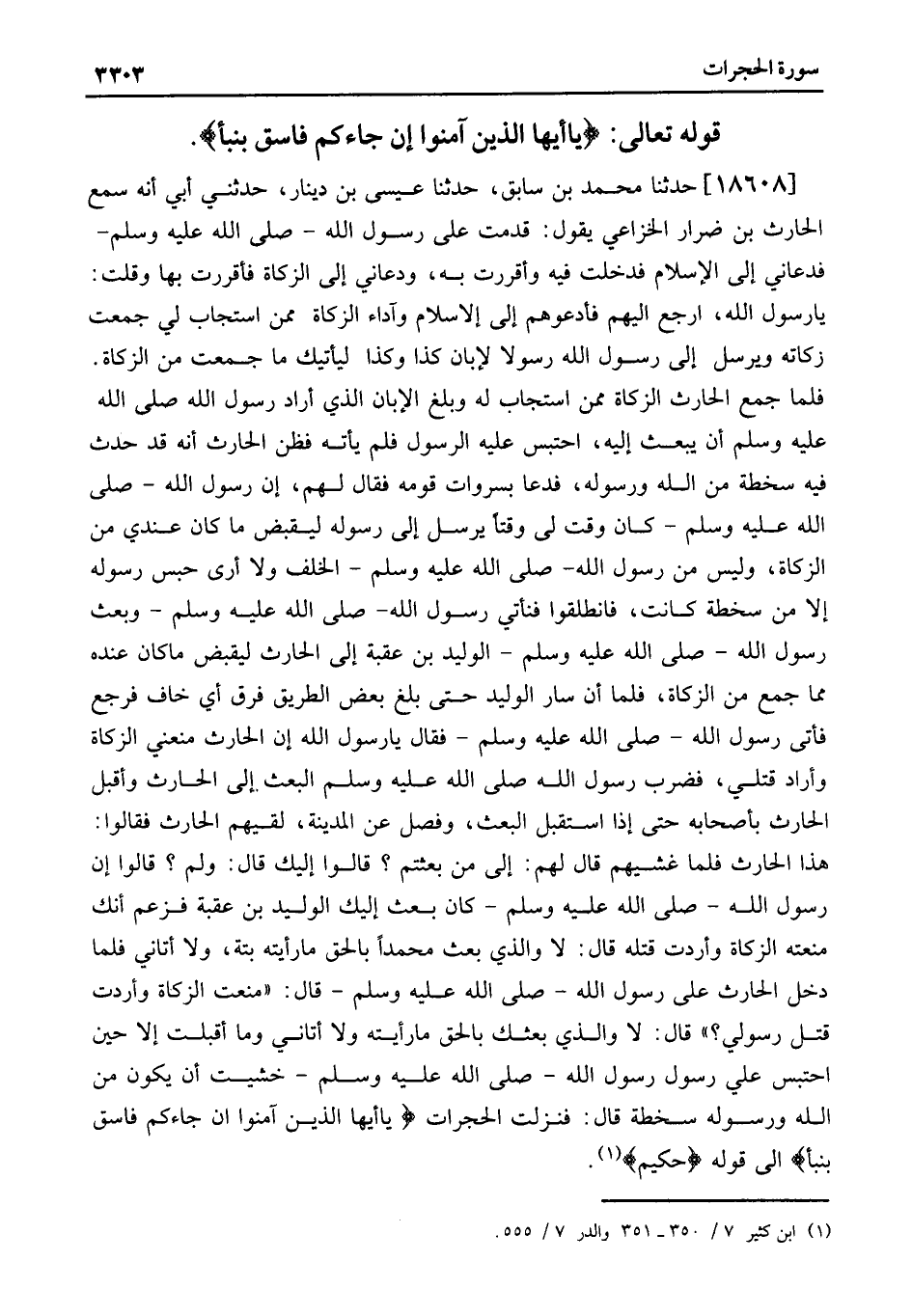 هَذَا الْحَارِثُ فَلَمَّا غَشِيَهُمْ قَالَ لَهُمْ: إِلى مَنْ بُعِثْتُمْ؟ قَالُوا إِلَيْكَ قَالَ: وَلِمَ؟ قَالُوا إِنَّ رَسُولَ اللَّهِ- صَلَّى اللَّهُ عَلَيْهِ وَسَلَّمَ- كَانَ بَعَثَ إِلَيْكَ الْوَلِيدَ بْنَ عُقْبَةَ فَزَعَمَ أَنَّكَ مَنَعْتَهُ الزَّكَاةَ وَأَرَدْتَ قَتْلَهُ قَالَ: لَا وَالَّذِي بَعَثَ مُحَمَّدًا بِالْحَقِّ مَا رَأَيْتُهُ بَتَّةَ، وَلا أَتَانِي فَلَمَّا دَخَلَ الْحَارِثُ عَلَى رَسُولِ اللَّهِ- صَلَّى اللَّهُ عَلَيْهِ وَسَلَّمَ- قَالَ: «مَنَعْتَ الزَّكَاةَ وَأَرَدْتَ قَتْلَ رَسُولِي؟» قَالَ: لَا وَالَّذِي بَعَثَكَ بِالْحَقِّ مَا رَأَيْتُهُ وَلا أَتَانِي وَمَا أَقْبَلْتُ إِلا حِينَ احْتُبِسَ عَلَيَّ رَسُولِ رَسُولِ اللَّهِ- صَلَّى اللَّهُ عَلَيْهِ وَسَلَّمَ- خَشِيتُ أَنْ يَكُونَ مِنَ اللَّهِ وَرَسُولِهِ سُخْطَةٌ قَالَ: فَنَزَلَتِ الْحُجُرَاتُ يَا أَيُّهَا الَّذِينَ آمَنُوا إِنْ جَاءَكُمْ فَاسِقٌ بِنَبَأٍ إِلَى قوله حكيم «1» .