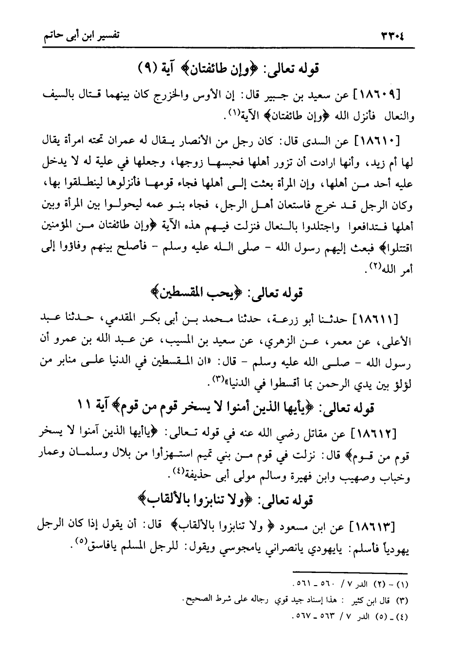 18609 - عَنْ سَعِيدِ بْنِ جُبَيْرٍ قَالَ: إِنَّ الْأَوْسَ وَالْخَزْرَجَ كَانَ بَيْنَهُمَا قِتَالٌ بِالسَّيْفِ وَالنِّعَالِ فَأَنْزَلَ اللَّهُ وَإِنْ طَائِفَتَانِ الْآيَةَ «1» .