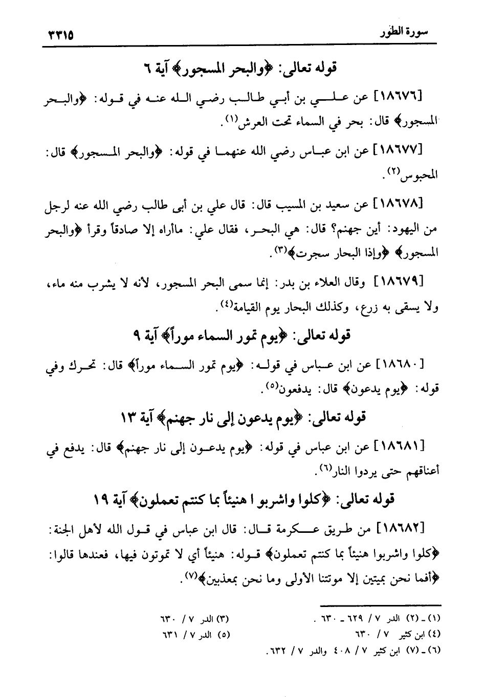 18676 - عَنْ عَلِيَّ بْنَ أَبِي طَالِبٍ رَضِيَ اللَّهُ عَنْهُ فِي قَوْلِهِ: وَالْبَحْرِ الْمَسْجُورِ قَالَ: بَحْرٌ فِي السَّمَاءِ تَحْتَ الْعَرْشِ «1» .