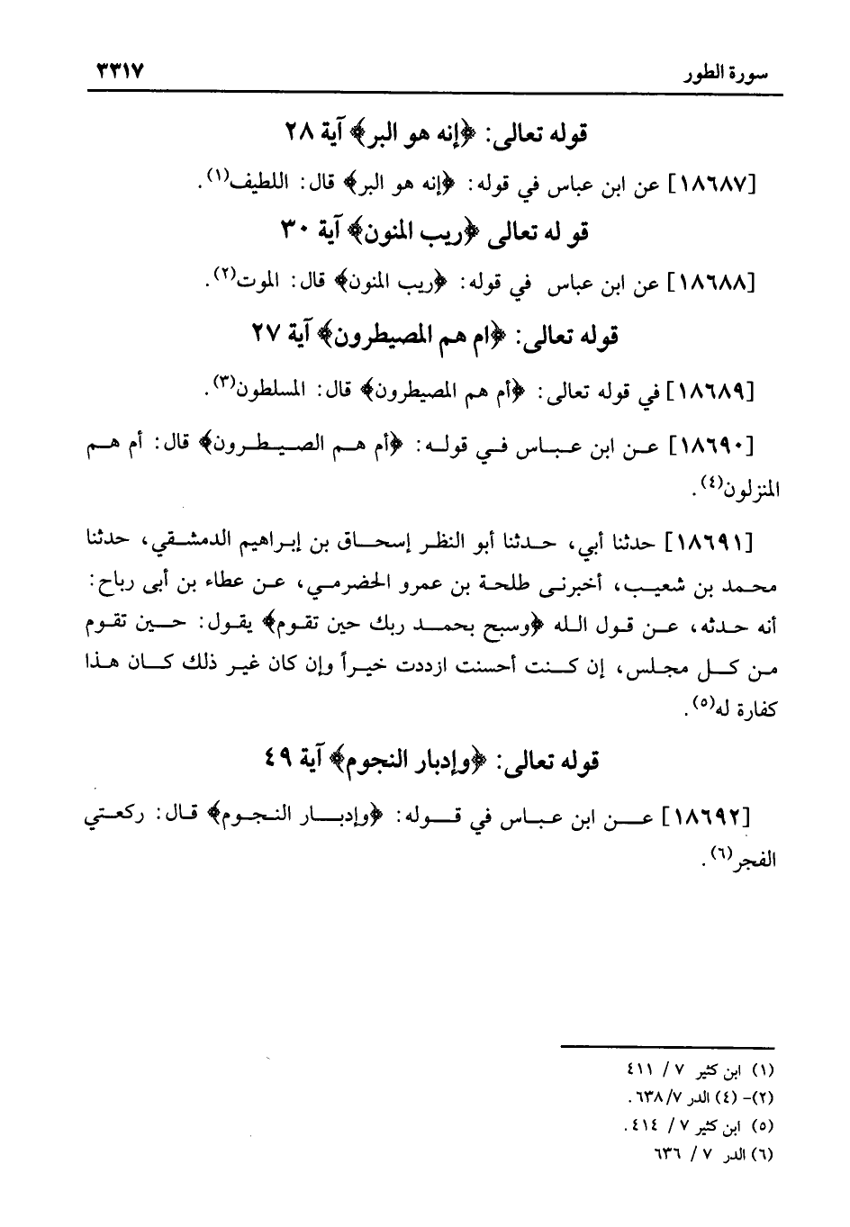 18690 - عَنِ ابْنِ عَبَّاسٍ فِي قَوْلِهِ: أَمْ هُمُ الْمُصَيْطِرُونَ قَالَ: أَمْ هُمُ الْمُنْزِلُونَ «4» .
