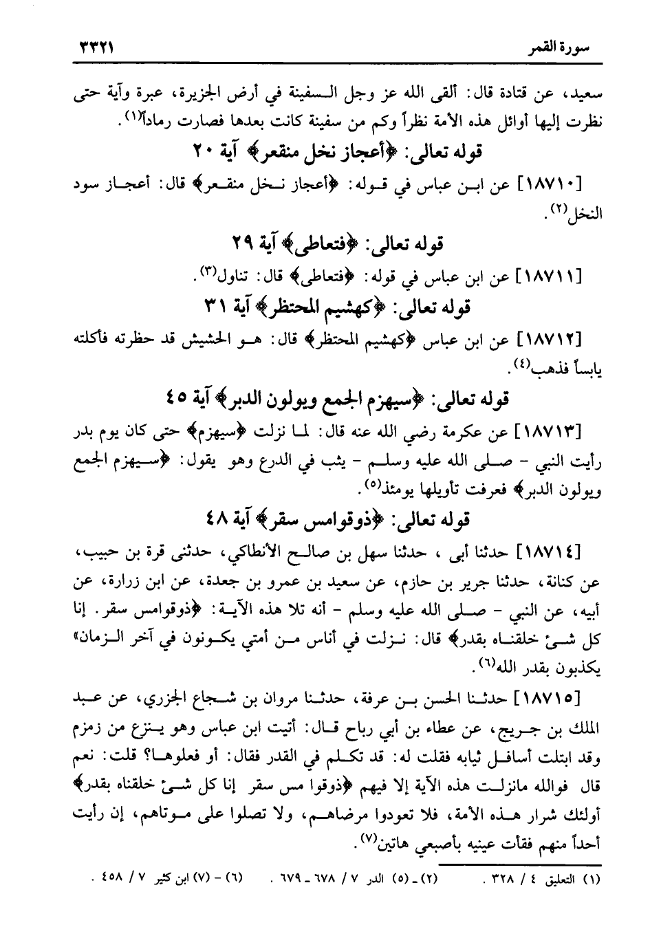 18713 - عَنْ عِكْرَمَةَ رَضِيَ اللَّهُ عَنْهُ قَالَ: لَمَّا نَزَلَتْ سَيُهْزَمُ حَتَّى كَانَ يَوْمُ بَدْرٍ رَأَيْتُ النَّبِيَّ- صَلَّى اللَّهُ عَلَيْهِ وَسَلَّمَ- يَثِبُ فِي الدِّرْعِ وَهُوَ يَقُولُ: سَيُهْزَمُ الْجَمْعُ وَيُوَلُّونَ الدُّبُرَ فَعَرَفْتُ تَأْوِيلَهَا يَوْمَئْذٍ «5» .