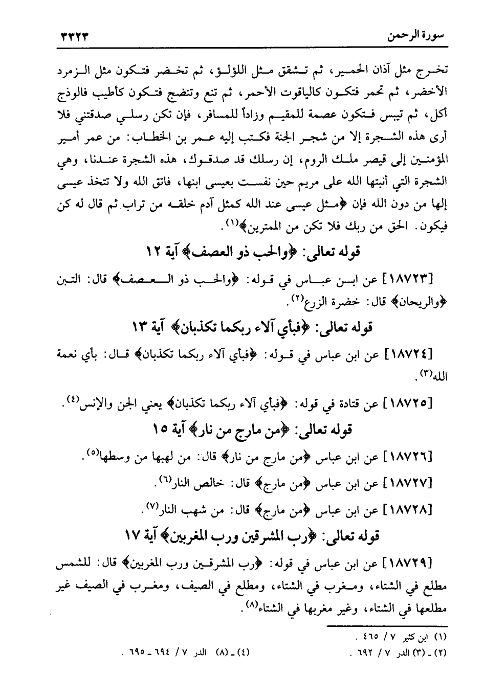18729 - عَنِ ابْنِ عَبَّاسٍ فِي قَوْلِهِ: رَبُّ الْمَشْرِقَيْنِ وَرَبُّ الْمَغْرِبَيْنِ قَالَ: لِلشَّمْسِ مَطْلَعٌ فِي الشِّتَاءِ، وَمَغْرِبٌ فِي الشِّتَاءِ، وَمَطْلَعٌ فِي الصَّيْفِ، وَمَغْرِبٌ فِي الصَّيْفِ غَيْرُ مَطَلِعِهَا فِي الشِّتَاءِ، وَغَيْرُ مَغَرِبِهَا فِي الشتاء «8» .