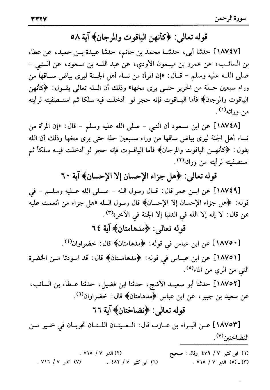 18751 - عَنِ ابْنِ عَبَّاسٍ فِي قَوْلِهِ: مدهامتان قال: قد اسْوَدَّتَا مِنَ الْخُضْرَةِ الَّتِي مِنَ الرَّيِّ مِنَ الْمَاءِ «5» .
