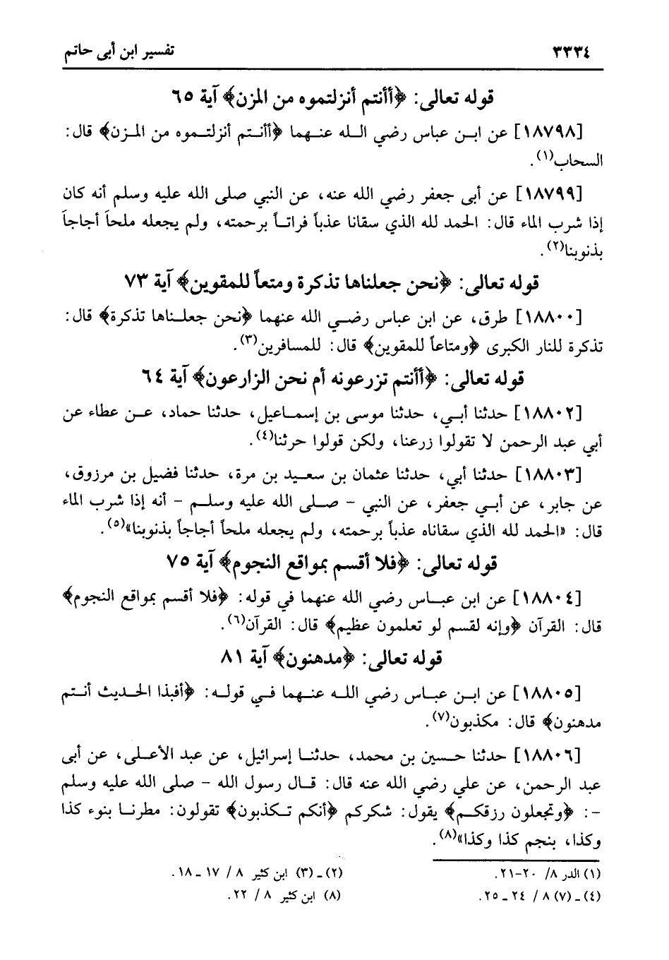 18805 - عَنِ ابْنِ عَبَّاسٍ رَضِيَ اللَّهُ عَنْهُمَا فِي قَوْلِهِ: أَفَبِهَذَا الْحَدِيثِ أَنْتُمْ مُدْهِنُونَ قَالَ: مُكَذِّبُونَ «7» .