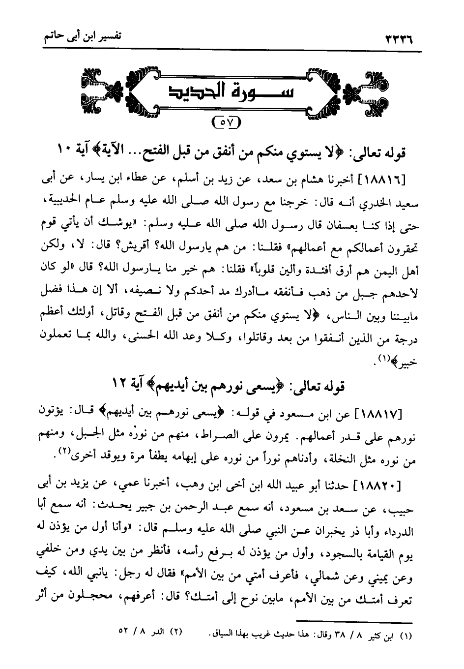 18817 - عَنِ ابْنِ مَسْعُودٍ فِي قَوْلِهِ: يَسْعَى نُورُهُم بَيْنَ أَيْدِيهِمْ قَالَ: يُؤْتَوْنَ نُورَهُمْ عَلَى قَدْرِ أَعْمَالِهِمْ. يَمُرُّونَ عَلَى الصِّرَاطِ، مِنْهُمْ مَنْ نُورُهُ مِثْلُ الْجَبَلِ، وَمِنْهُمْ مَنْ نُورُهُ مِثْلُ النَّخْلَةِ، وَأَدْنَاهُمْ نُورًا مَنْ نُورُهُ عَلَى إِبْهَامِهِ يُطْفَأَ مَرَّةً وَيُوقَدُ أُخْرَى «2» .