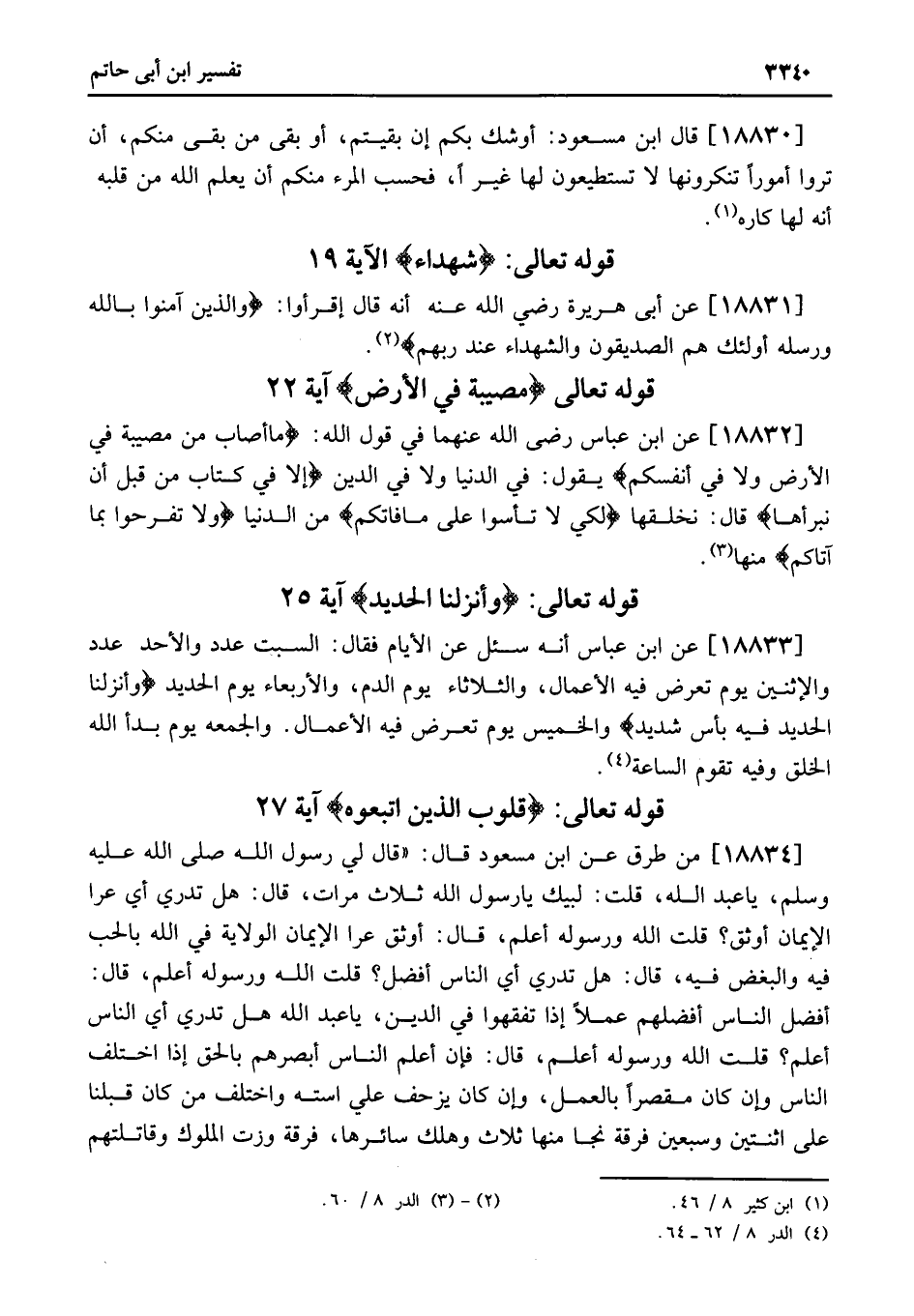 18831 - عَنْ أَبِي هُرَيْرَةَ رَضِيَ اللَّهُ عَنْهُ أَنَّهُ قال اقرأوا: وَالَّذِينَ آمَنُوا بِاللَّهِ وَرُسُلِهِ أُوْلَئِكَ هُمُ الصِّدِّيقُونَ وَالشُّهَدَاءُ عِندَ رَبِّهِمْ «2» .