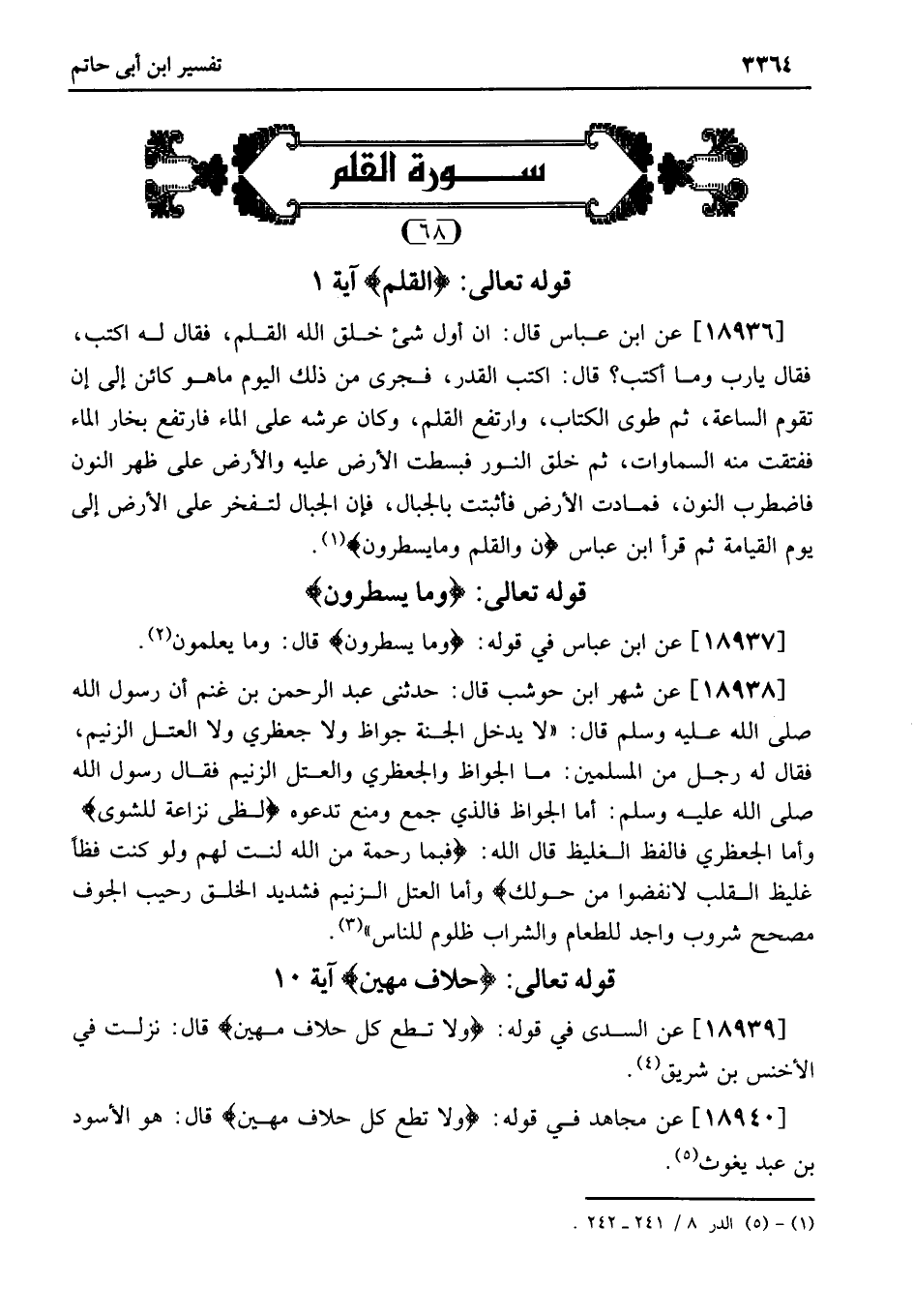 18936 - عَنِ ابْنِ عَبَّاسٍ قَالَ: إِنَّ أَوَّلَ شَيْءٍ خَلَقَ اللَّهُ الْقَلَمُ، فَقَالَ لَهُ اكْتُبْ، فَقَالَ يَا رَبِّ وَمَا أَكْتُبُ؟ قَالَ: اكْتُبِ الْقَدْرَ، فَجَرَى مِنْ ذَلِكَ الْيَوْمِ مَا هُوَ كَائِنٌ إِلَى أَنْ تَقُومَ السَّاعَةُ، ثُمَّ طَوَى الْكِتَابَ، وَارْتَفَعَ الْقَلَمُ، وَكَانَ عَرْشُهُ عَلَى الْمَاءِ فَارْتَفَعَ بُخَارُ الْمَاءِ فَفُتِقَتْ مِنْهُ السَّمَاوَاتُ، ثُمَّ خُلِقَ النُّورُ فَبُسِطَتِ الْأَرْضُ عَلَيْهِ وَالْأَرْضُ عَلَى ظَهْرِ النُّونِ فَاضْطَرَبَ النُّونُ، فَمَادَتِ الْأَرْضُ فَأُثْبِتَتْ بِالْجِبَالِ، فَإِنَّ الْجِبَالَ لَتَفْخَرُ عَلَى الْأَرْضِ إِلَى يَوْمِ الْقِيَامَةِ ثُمَّ قَرَأَ ابْنُ عَبَّاسٍ ن وَالْقَلَمِ وَمَا يَسْطُرُونَ «1» .
