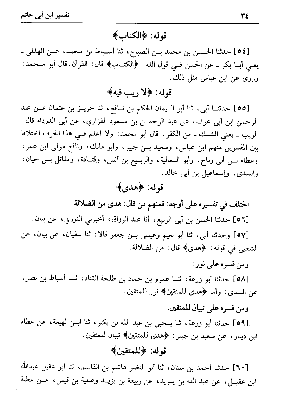 54 - حَدَّثَنَا الْحَسَنُ بْنُ مُحَمَّدِ بْنِ الصَّبَّاحِ، ثنا أَسْبَاطُ بْنُ مُحَمَّدٍ، عَنِ الْهُذَلِيِّ- يَعْنِي أَبَا بَكْرٍ- عَنِ الْحَسَنِ فِي قَوْلِ اللَّهِ: الْكِتَابُ قَالَ: الْقُرْآنُ. قَالَ أَبُو مُحَمَّدٍ: