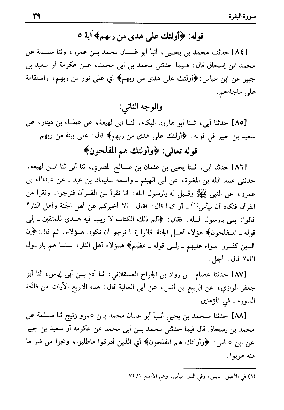 84 - حَدَّثَنَا مُحَمَّدُ بْنُ يَحْيَى، أَنْبَأَ أَبُو غَسَّانَ مُحَمَّدُ بْنُ عَمْرٍو، وثنا سَلَمَةُ عَنْ مُحَمَّدِ ابْنَ إِسْحَاقَ قَالَ: فِيمَا حَدَّثَنِي مُحَمَّدُ بْنُ أَبِي مُحَمَّدٍ، عَنْ عِكْرِمَةَ أَوْ سَعِيدِ بْنِ جُبَيْرٍ عَنِ ابْنِ عَبَّاسٍ: أُولَئِكَ عَلَى هُدًى مِنْ رَبِّهِمْ أَيْ عَلَى نُورٍ مِنْ رَبِّهِمْ، وَاسْتِقَامَةٍ عَلَى مَا جَاءَهُمْ.
