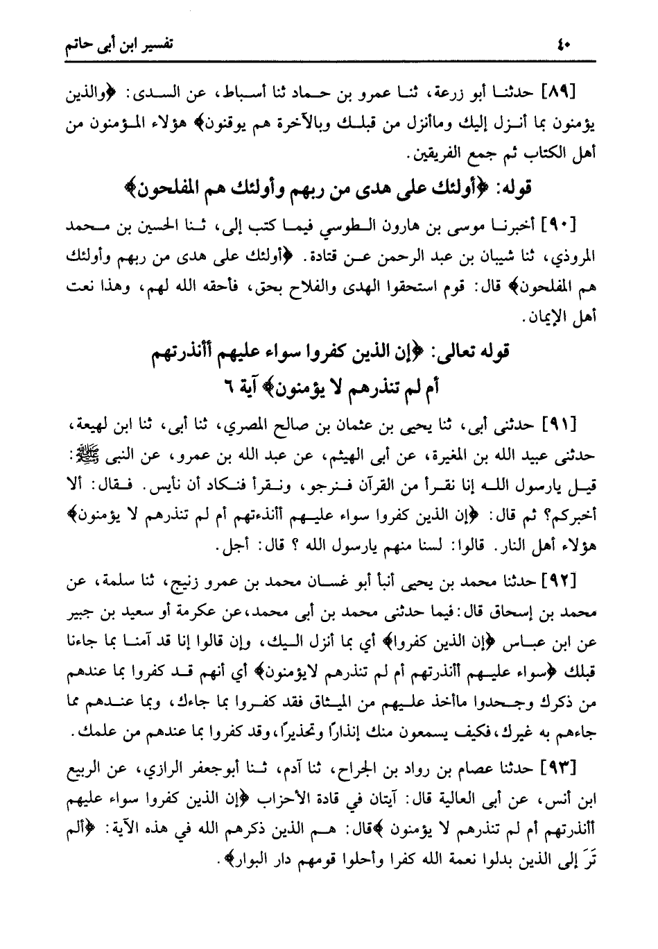 90 - أَخْبَرَنَا مُوسَى بْنُ هَارُونَ الطُّوسِيُّ فِيمَا كَتَبَ إِلَيَّ، ثنا الْحُسَيْنُ بْنُ مُحَمَّدٍ الْمَرُّوذِيُّ، ثنا شَيْبَانُ بْنُ عَبْدِ الرَّحْمَنِ عَنْ قَتَادَةَ. أُولَئِكَ عَلَى هُدًى مِنْ رَبِّهِمْ وَأُولَئِكَ هُمُ الْمُفْلِحُونَ قَالَ: قَوْمٌ اسْتَحَقُّوا الْهُدَى وَالْفَلاحَ بِحَقٍّ، فَأَحَقَّهُ اللَّهُ لَهُمْ، وَهَذَا نَعْتُ أَهْلِ الإِيمَانِ.