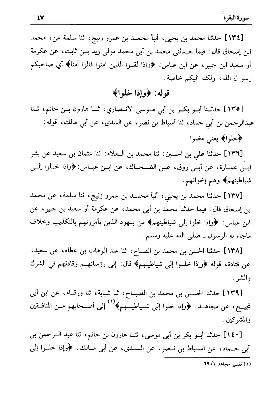 137 - حَدَّثَنَا مُحَمَّدُ بْنُ يَحْيَى، أَنْبَأَ مُحَمَّدُ بْنُ عَمْرٍو زُنَيْجٌ، ثنا سَلَمَةُ، عَنْ مُحَمَّدِ بْنِ إِسْحَاقَ قَالَ: فِيمَا حَدَّثَنَا مُحَمَّدُ بْنُ أَبِي مُحَمَّدٍ، عَنْ عِكْرِمَةَ أَوْ سَعِيدِ بْنِ جُبَيْرٍ، عَنِ ابْنِ عَبَّاسٍ: وَإِذَا خَلَوْا إِلَى شَيَاطِينِهِمْ مَنْ يَهُودَ الَّذِينَ يَأْمُرُونَهُمْ بِالتَّكْذِيبِ وَخِلافِ مَا جَاءَ بِهِ الرَّسُولُ- صَلَّى اللَّهُ عَلَيْهِ وَسَلَّمَ.