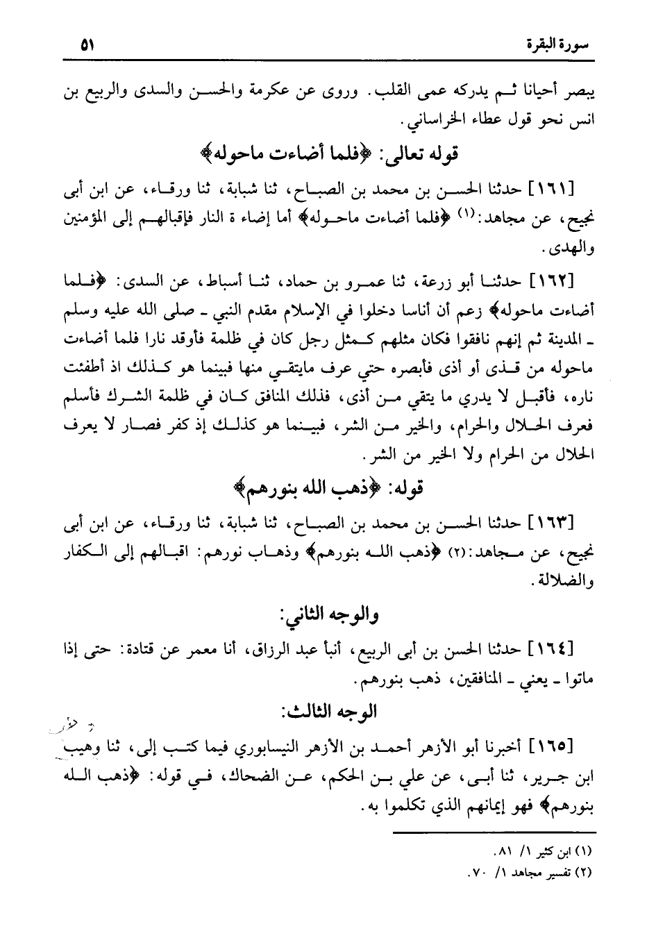 163 - حَدَّثَنَا الْحَسَنُ بْنُ مُحَمَّدِ بْنِ الصَّبَّاحِ، ثنا شَبَابَةُ، ثنا وَرْقَاءُ، عَنِ ابْنِ أَبِي نَجِيحٍ، عَنْ مُجَاهِدٍ: «2» ذَهَبَ اللَّهُ بِنُورِهِمْ وَذَهَابُ نُورِهِمْ: إِقْبَالُهُمْ إِلَى الْكُفَّارِ وَالضَّلالَةِ.