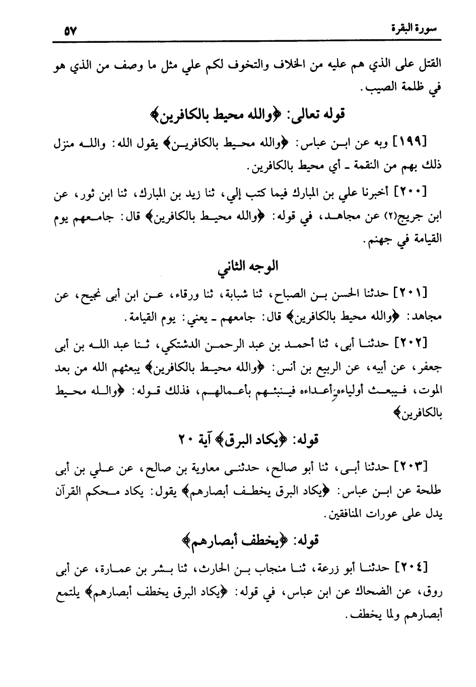201 - حَدَّثَنَا الْحَسَنُ بْنُ الصَّبَّاحِ، ثنا شَبَابَةُ، ثنا وَرْقَاءُ، عَنِ ابْنِ أَبِي نجيح، عن مُجَاهِدٍ: وَاللَّهُ مُحِيطٌ بِالْكَافِرِينَ قَالَ: جَامِعُهُمْ- يَعْنِي: يَوْمَ الْقِيَامَةِ.