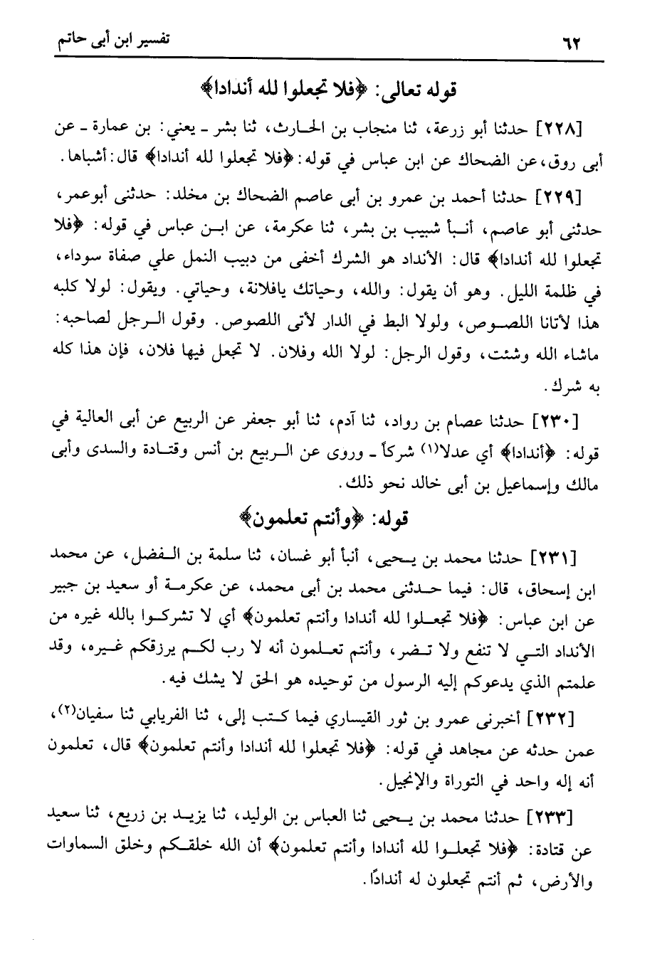 228 - حَدَّثَنَا أَبُو زُرْعَةَ، ثنا مِنْجَابُ بْنُ الْحَارِثِ، ثنا بشر- يعني: بْنُ عُمَارَةَ- عَنْ أَبِي رَوْقٍ، عَنِ الضَّحَّاكِ عَنِ ابْنِ عَبَّاسٍ فِي قَوْلِهِ: فَلا تَجْعَلُوا لِلَّهِ أَنْدَادًا قَالَ: أَشْبَاهًا.