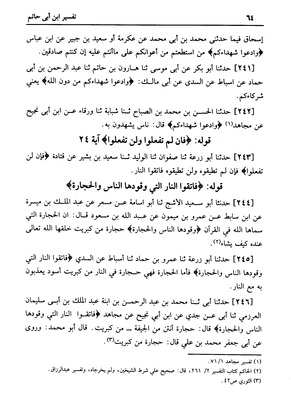 241 - حَدَّثَنَا أَبُو بَكْرِ عن أَبِي مُوسَى ثنا هَارُونُ بْنُ حَاتِمٍ ثنا عَبْدُ الرَّحْمَنِ بْنُ أَبِي حَمَّادٍ عَنْ أَسْبَاطِ عَنِ السُّدِّيِّ عَنْ أَبِي مَالِكٍ: وَادْعُوا شُهَدَاءَكُمَ مِنْ دُونِ اللَّهِ يَعْنِي شُرَكَاءَكُمْ.