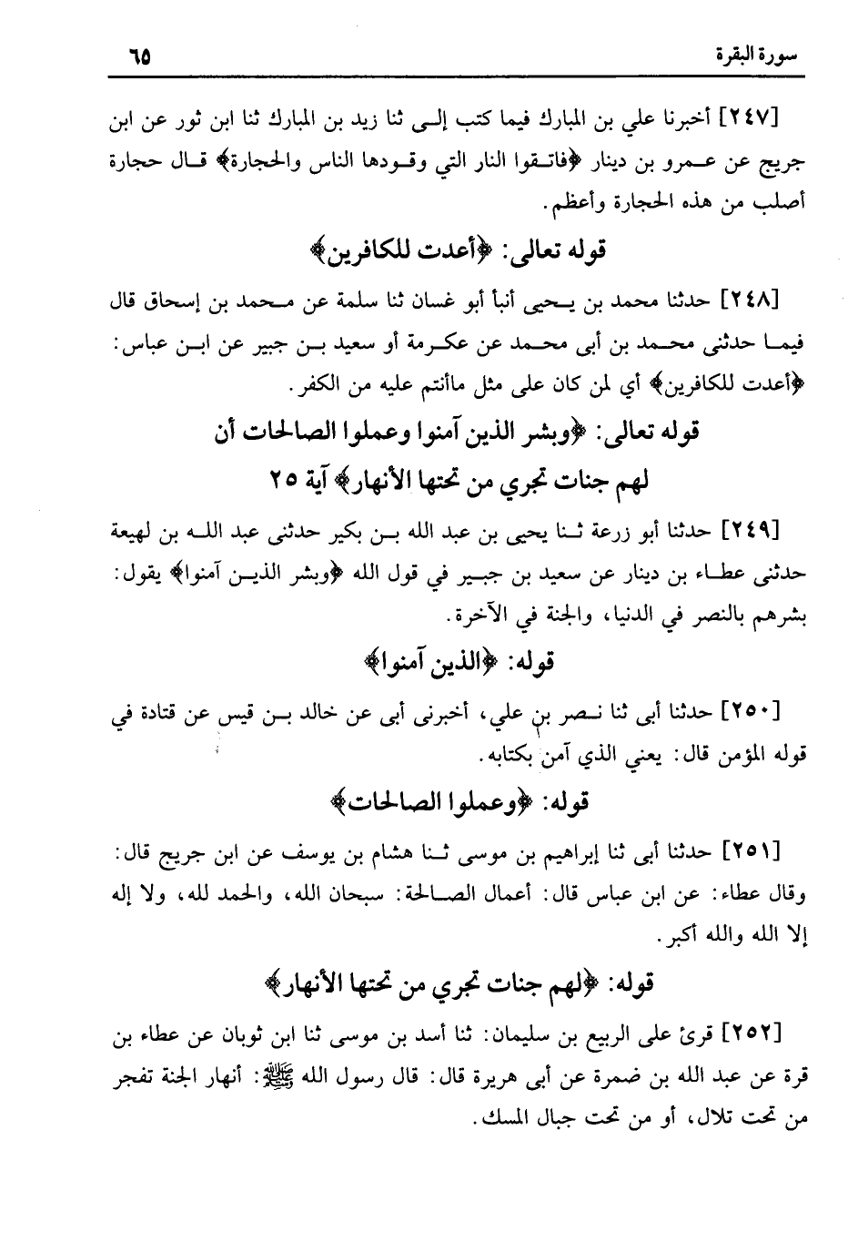 249 - حَدَّثَنَا أَبُو زُرْعَةَ ثنا يَحْيَى بْنُ عَبْدِ اللَّهِ بْنِ بُكَيْرٍ حَدَّثَنِي عَبْدُ اللَّهِ بْنُ لَهِيعَةَ حَدَّثَنِي عَطَاءُ بْنُ دِينَارٍ عَنْ سَعِيدِ بْنُ جُبَيْرٍ فِي قَوْلِ اللَّهِ وَبَشِّرِ الَّذِينَ آمَنُوا يَقُولُ:
