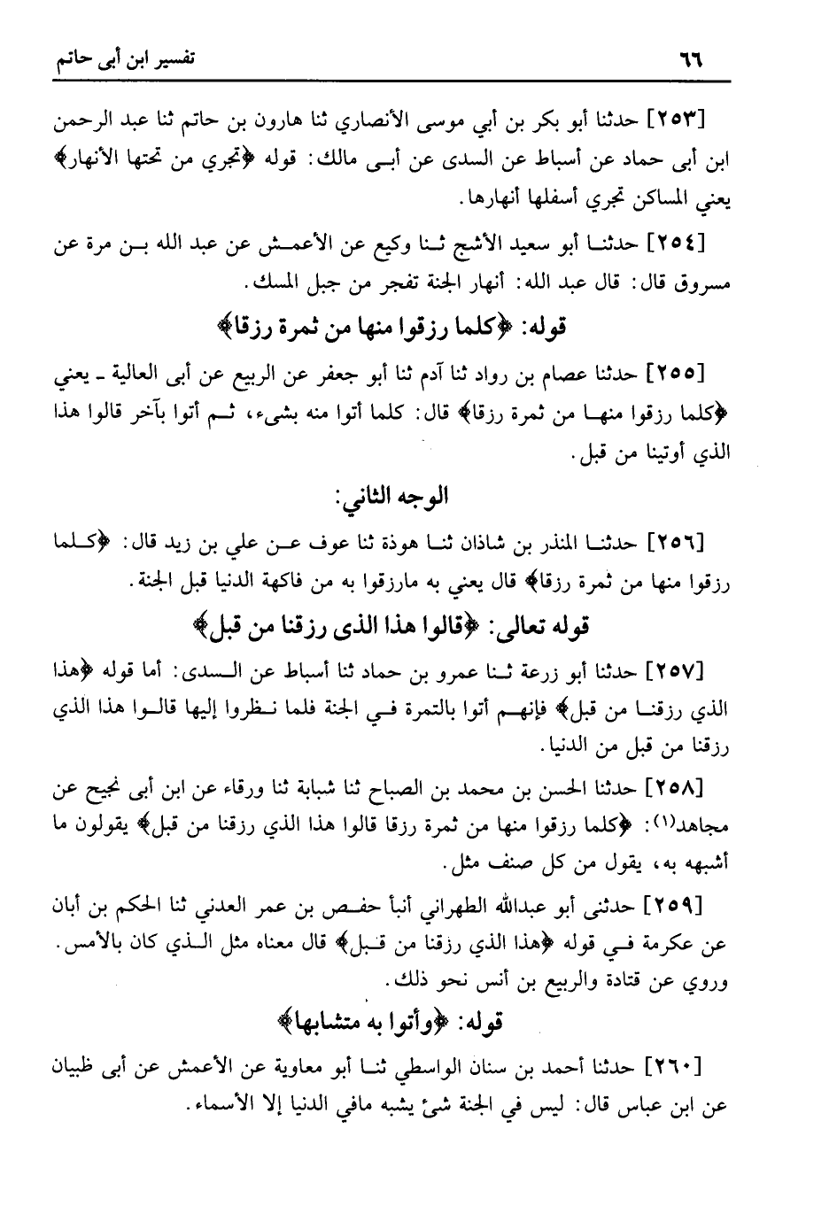 257 - حَدَّثَنَا أَبُو زُرْعَةَ ثنا عَمْرُو بْنُ حَمَّادٍ ثنا أَسْبَاطٌ عَنِ السُّدِّيِّ: أَمَّا قَوْلُهُ هَذَا الَّذِي رُزِقْنَا مِنْ قَبْلُ فَإِنَّهُمْ أَتَوْا بِالتَّمْرَةِ فِي الْجَنَّةِ فَلَمَّا نَظَرُوا إِلَيْهَا قَالُوا هَذَا الَّذِي رُزِقْنَا مِنْ قَبْلُ مِنَ الدُّنْيَا.