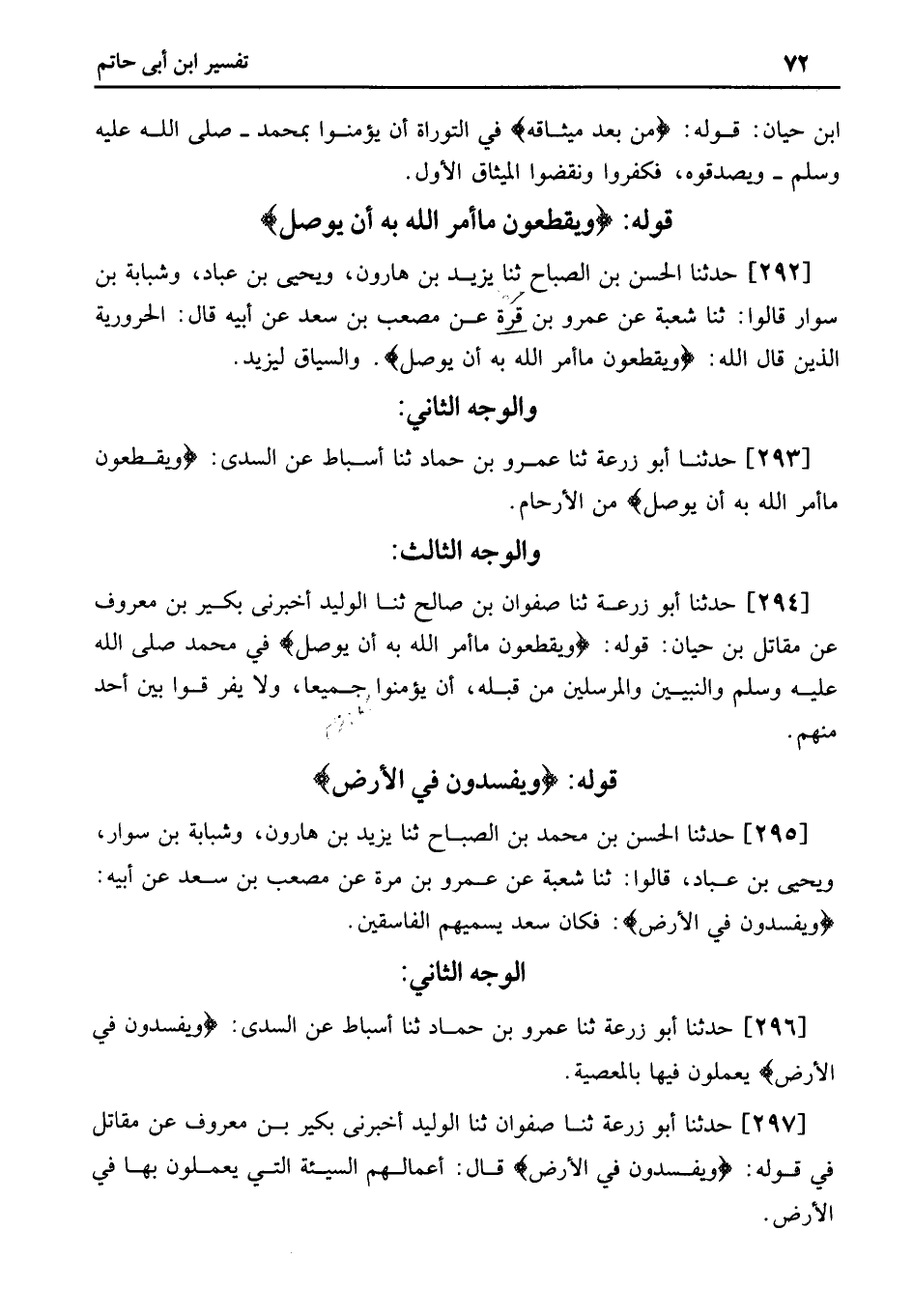 293 - حَدَّثَنَا أَبُو زُرْعَةَ ثنا عَمْرُو بْنُ حَمَّادٍ ثنا أَسْبَاطٌ عَنِ السُّدِّيِّ: وَيَقْطَعُونَ مَا أَمَرَ اللَّهُ بِهِ أَنْ يُوصَلَ مِنَ الأَرْحَامِ.