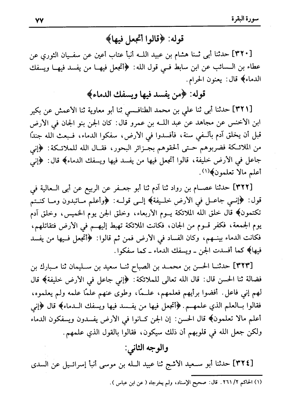 323 - حَدَّثَنَا الْحَسَنُ بْنُ مُحَمَّدِ بْنِ الصَّبَّاحِ ثنا سَعِيدُ بْنُ سُلَيْمَانَ ثنا مُبَارَكُ بْنُ فَضَالَةَ ثنا الْحَسَنُ قَالَ: قَالَ اللَّهُ تَعَالَى لِلْمَلائِكَةِ: إِنِّي جَاعِلٌ فِي الأَرْضِ خَلِيفَةً قَالَ لَهُمْ إِنِيِّ فَاعِلٌ. أَفْضَوْا بِرَأْيهِمْ فَعَلَّمَهُمْ، عِلْمًا، وَطَوَى عَنْهُمْ عِلْمًا عَلِمَهُ وَلَمْ يَعْلَمُوهُ، فَقَالُوا بِالْعِلْمِ الَّذِي عَلَّمَهُمْ. أَتَجْعَلُ فِيهَا مَنْ يُفْسِدُ فِيهَا وَيَسْفِكُ الدِّمَاءَ قَالَ إِنِّي أَعْلَمُ مَا لَا تَعْلَمُونَ قَالَ الْحَسَنُ: إِنَّ الْجِنَّ كَانُوا فِي الأَرْضِ يُفْسِدُونَ وَيَسْفِكُونَ الدِّمَاءَ وَلَكِنْ جَعَلَ اللَّهُ فِي قُلُوبِهِمْ أَنَّ ذَلِكَ سَيَكُونُ، فَقَالُوا بِالْقَوْلِ الَّذِي عَلَّمَهُمْ.