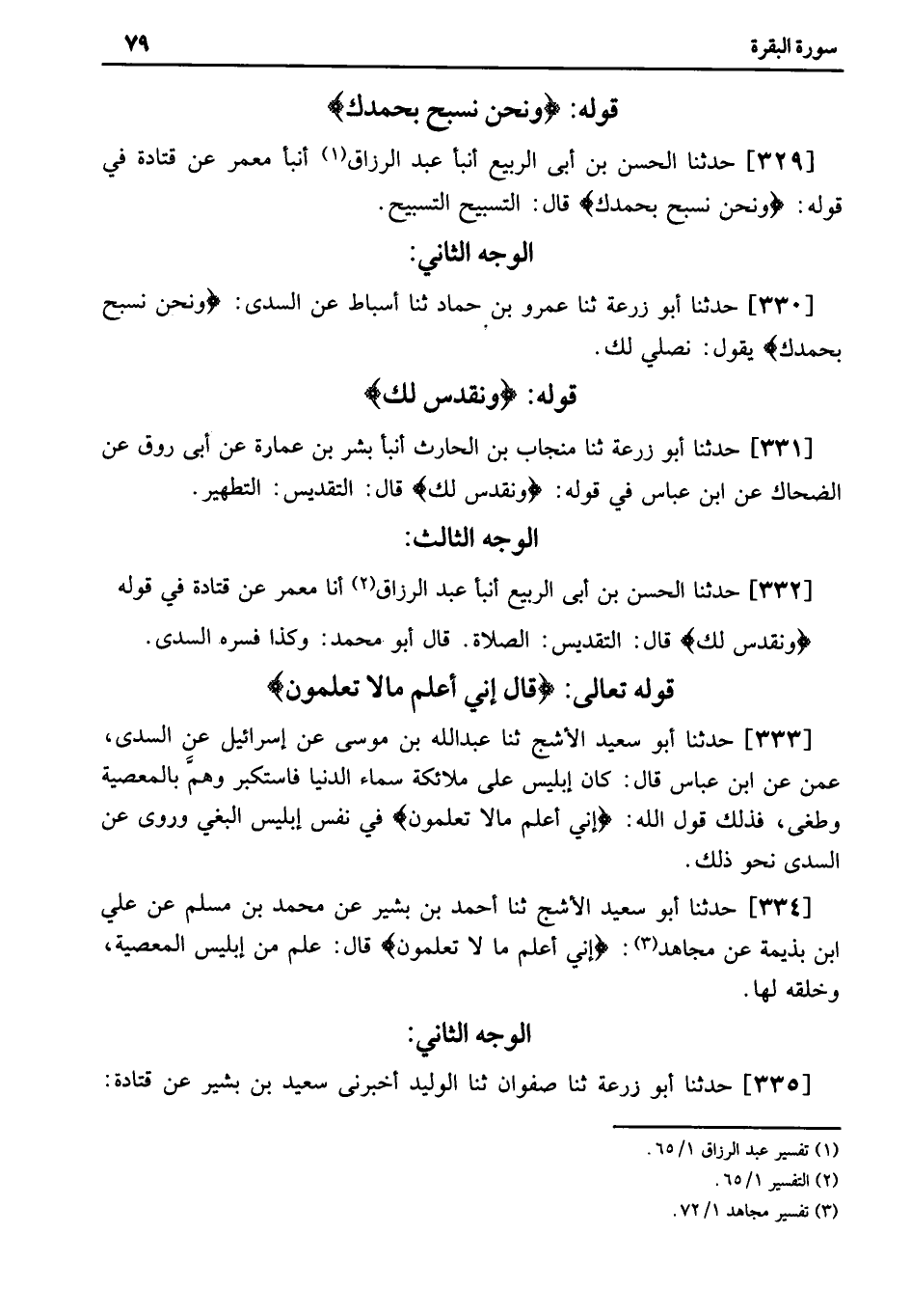332 - حَدَّثَنَا الْحَسَنُ بْنُ أَبِي الرَّبِيعِ أَنْبَأَ عَبْدُ الرَّزَّاقِ «2» أنا مَعْمَرٌ عَنْ قَتَادَةَ فِي قَوْلِهِ وَنُقَدِّسُ لَكَ قَالَ: التَّقْدِيسُ: الصَّلاةُ. قَالَ أَبُو مُحَمَّدٍ: وَكَذَا فَسَّرَهُ السُّدِّيُّ.
