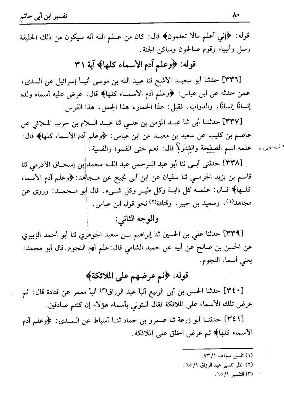 338 - حَدَّثَنِي أَبِي ثنا أَبُو عَبْدِ الرَّحْمَنِ عَبْدُ اللَّهِ مُحَمَّدِ بْنِ إِسْحَاقَ الأَذْرَمِيُّ ثنا قَاسِمُ بْنُ يَزِيدَ الْجَرْمِيُّ ثنا سُفْيَانُ عَنِ ابْنِ أَبِي نَجِيحٍ عَنْ مُجَاهِدٍ: وَعَلَّمَ آدَمَ الأَسْمَاءَ كُلَّهَا قَالَ: عَلَّمَهُ كُلَّ دَابَّةٍ وَكُلَّ طَيْرٍ وَكُلَّ شَيْءٍ. قَالَ أَبُو مُحَمَّدٍ: وَرُوِيَ عَنْ مُجَاهِدٍ «1» ، وَسَعِيدِ بْنِ جُبَيْرٍ، وَقَتَادَةَ «2» نَحْوُ قَوْلِ ابْنِ عَبَّاسٍ.