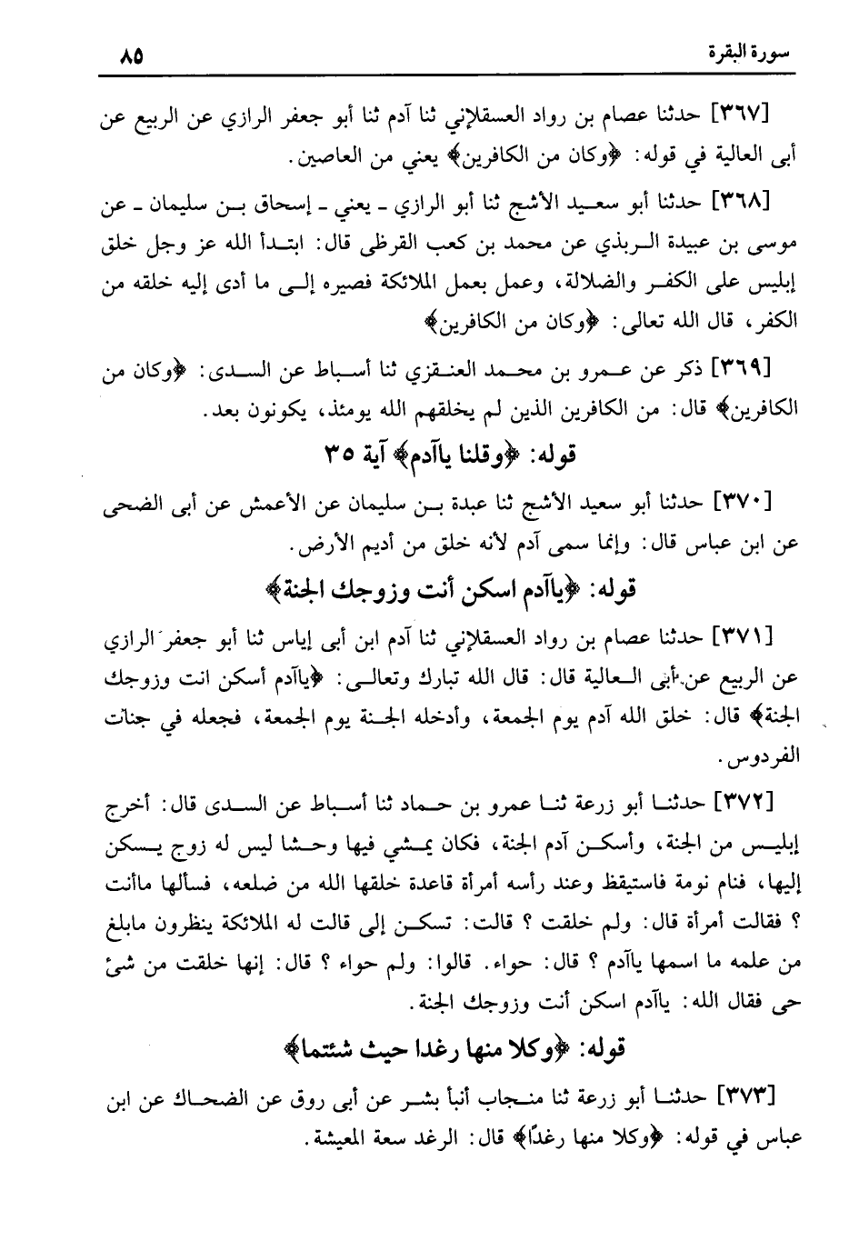 367 - حَدَّثَنَا عِصَامُ بْنُ رَوَّادٍ الْعَسْقَلانِيُّ ثنا آدَمُ ثنا أَبُو جَعْفَرٍ الرَّازِيُّ عَنِ الرَّبِيعِ عَنْ أَبِي الْعَالِيَةِ فِي قَوْلُهُ: وَكَانَ مِنَ الْكَافِرِينَ يَعْنِي مِنَ الْعَاصِينَ.