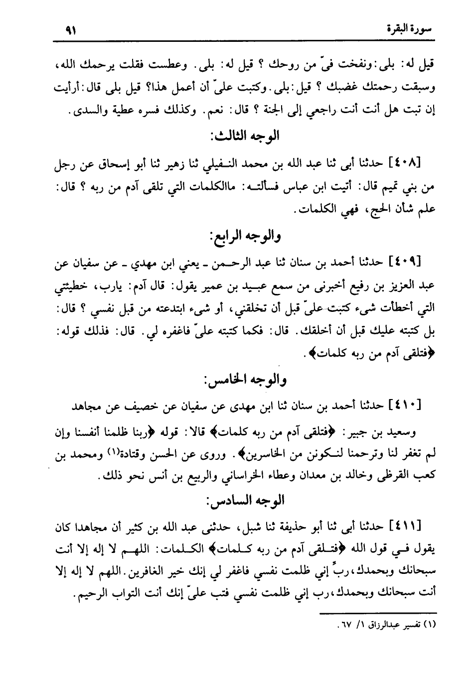 410 - حَدَّثَنَا أَحْمَدُ بْنُ سِنَانٍ ثنا ابْنُ مَهْدِيٍّ عَنْ سُفْيَانَ عَنْ خُصَيْفٍ عَنْ مُجَاهِدٍ وَسَعِيدِ بْنِ جُبَيْرٍ: فَتَلَقَّى آدَمُ مِنْ رَبِّهِ كَلِمَاتٍ قَالا: قَوْلُهُ رَبَّنَا ظَلَمْنَا أَنْفُسَنَا وَإِنْ لَمْ تَغْفِرْ لَنَا وَتَرْحَمْنَا لَنَكُونَنَّ مِنَ الْخَاسِرِينَ. وَرُوِيَ عَنِ الْحَسَنِ وَقَتَادَةَ «1» وَمُحَمَّدِ بْنِ كَعْبٍ الْقُرَظِيِّ وَخَالِدِ بْنِ مَعْدَانَ وَعَطَاءٍ الْخُرَاسَانِيِّ وَالرَّبِيعِ بْنِ أَنَسٍ نَحْوُ ذَلِكَ.