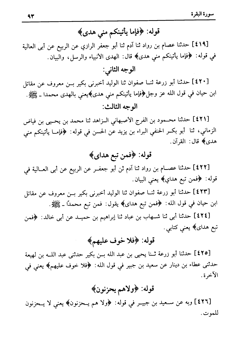 423 - حَدَّثَنَا أَبُو زُرْعَةَ ثنا صَفْوَانُ ثنا الْوَلِيدُ أَخْبَرَنِي بُكَيْرُ بْنُ مَعْرُوفٍ عَنْ مقاتل ابن حَيَّانَ فِي قَوْلِ اللَّهِ: فَمَنْ تَبِعَ هُدَايَ يَقُولُ: فَمَنْ تَبِعَ مُحَمَّدًا- صَلَّى اللَّهُ عَلَيْهِ وَسَلَّمَ.