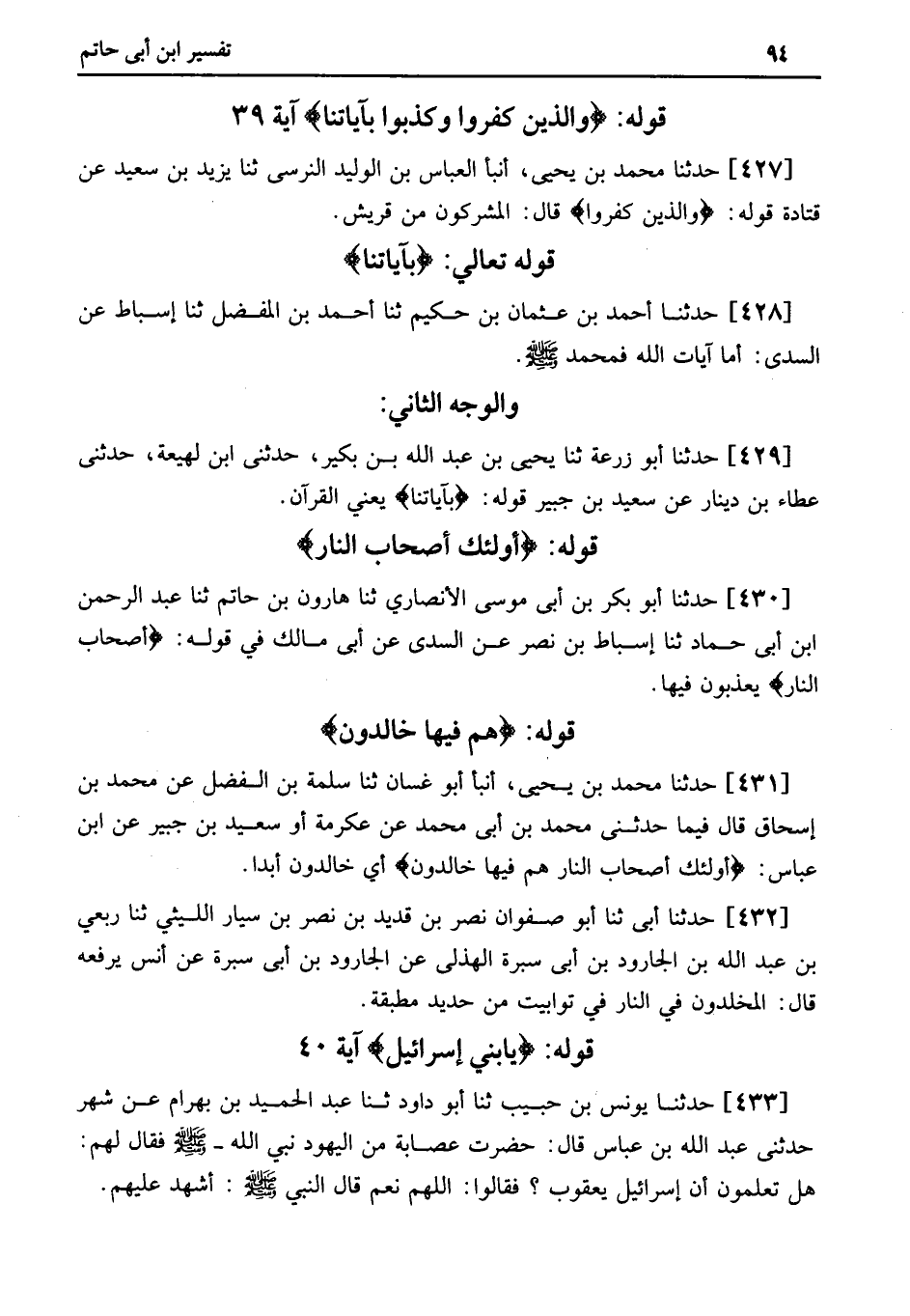 431 - حَدَّثَنَا مُحَمَّدُ بْنُ يَحْيَى، أَنْبَأَ أَبُو غَسَّانَ ثنا سَلَمَةُ بْنُ الْفَضْلِ عَنْ مُحَمَّدِ بْنِ إِسْحَاقَ قَالَ فِيمَا حَدَّثَنِي مُحَمَّدُ بْنُ أَبِي مُحَمَّدٍ عَنْ عِكْرِمَةَ أَوْ سَعِيدِ بْنِ جُبَيْرٍ عَنِ ابْنِ عَبَّاسٍ: أُولَئِكَ أَصْحَابُ النَّارِ هُمْ فِيهَا خَالِدُونَ أَيْ خَالِدُونَ أَبَدًا.