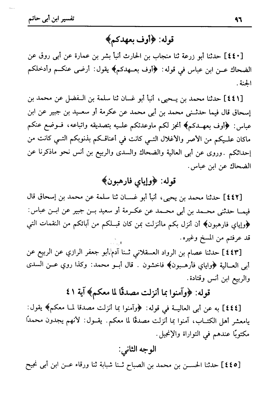 443 - حَدَّثَنَا عِصَامُ بْنُ الرَّوَّادِ العسقلاني ثنا آدم أَبُو جَعْفَرٍ الرَّازِيُّ عَنِ الرَّبِيعِ عَنْ أَبِي الْعَالِيَةِ وِإِيَّايَ فَارْهَبُونِ فَاخْشَوْنِ. قَالَ أَبُو مُحَمَّدٍ: وَكَذَا رُوِيَ عَنِ السدى والربيع ابن أَنَسٍ وَقَتَادَةَ.