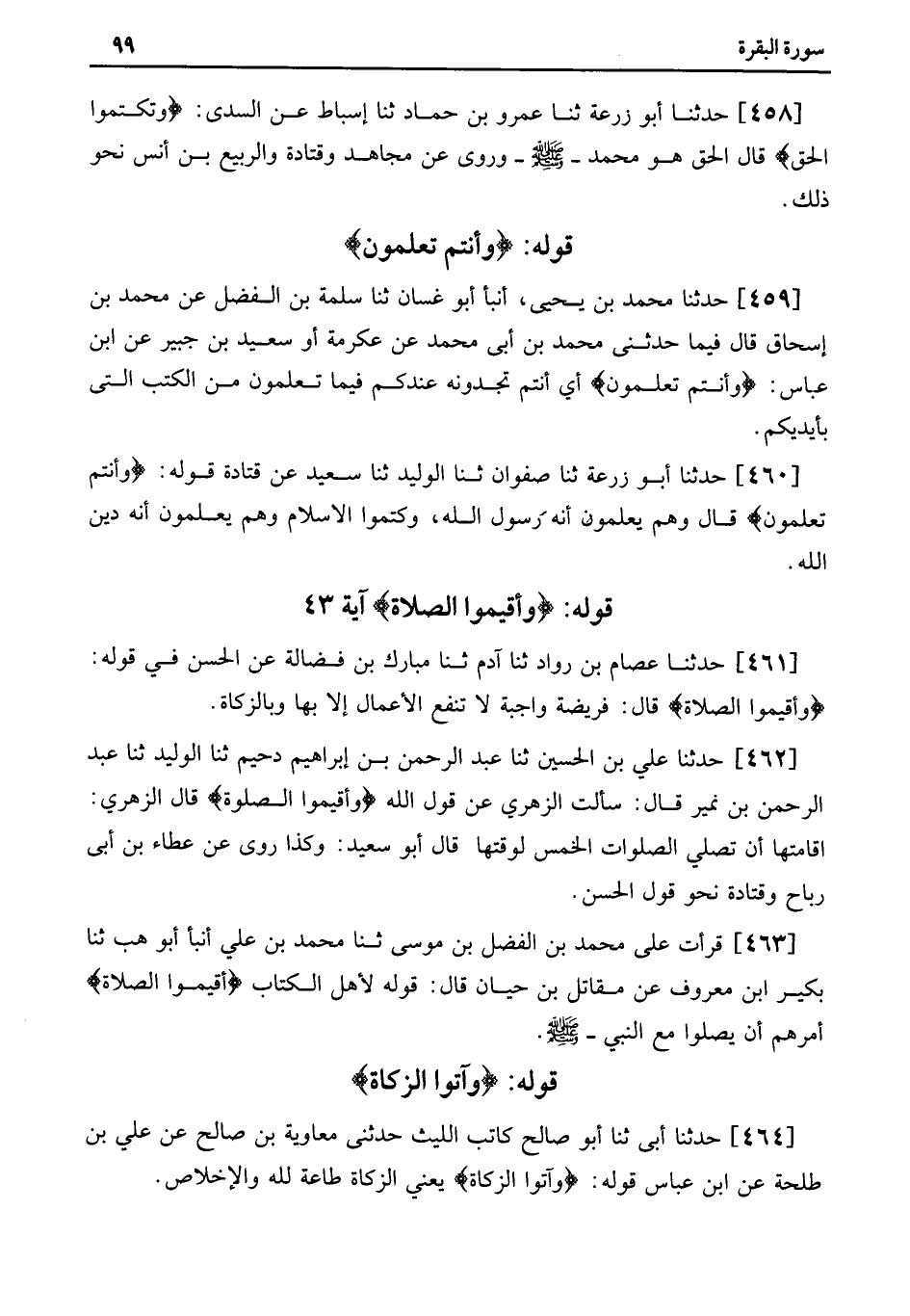 463 - قَرَأْتُ عَلَى مُحَمَّدِ بْنِ الْفَضْلِ بْنِ مُوسَى ثنا مُحَمَّدُ بْنُ عَلِيٍّ أَنْبَأَ أَبُو هب ثنا بكير ابن مَعْرُوفٍ عَنْ مُقَاتِلِ بْنِ حَيَّانَ قَالَ: قَوْلُهُ لأَهْلِ الْكِتَابِ أَقِيمُوا الصَّلاةَ أَمَرَهُمْ أَنْ يُصَلُّوا مَعَ النَّبِيِّ- صَلَّى اللَّهُ عَلَيْهِ وَسَلَّمَ.