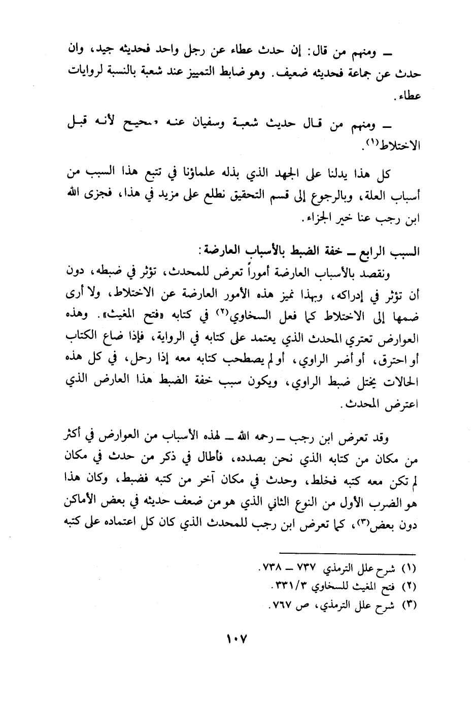 وقد تعرض ابن رجب - C - لهذه الأسباب من العوارض في أكثر من مكان من كتابه الذي نحن بصدده، فأطال في ذكر من حدث في مكان لم تكن معه كتبه فخلط، وحدث في مكان آخر من كتبه فضبط، وكان هذا هو الضرب الأول من النوع الثاني الذي هو من ضعف حديثه في بعض الأماكن دون بعض، كما تعرض ابن رجب للمحدث الذي كان كل اعتماده على كتبه