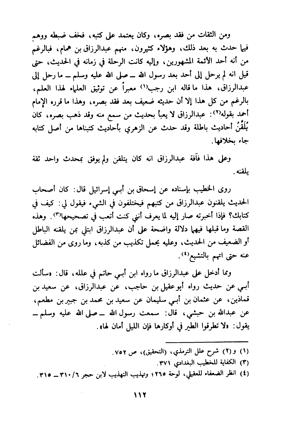 ومن الثقات من فقد بصره، وكان يعتمد على كتبه، فخف ضبطه ووهم فيما حدث به بعد ذلك، وهؤلاء كثيرون، منهم عبد الرزاق بن همام، فبالرغم من أنه أحد الأئمة المشهورين، وإليه كانت الرحلة في زمانه في الحديث، حتى قيل أنه لم يرحل إلى أحد بعد رسول الله A ما رحل إلى عبد الرزاق، هذا ما قاله ابن رجب معبرا عن توثيق العلماء لهذا العلم، بالرغم من كل هذا إلا أن حديثه ضعيف بعد فقد بصره، وهذا ما قرره الإمام أحمد بقوله: عبد الرزاق لا يعبأ بحديث من سمع منه وقد ذهب بصره، كان يلقن أحاديث باطلة وقد حدث عن الزهري بأحاديث كتبناها من أصل كتابه جاء بخلافها.
