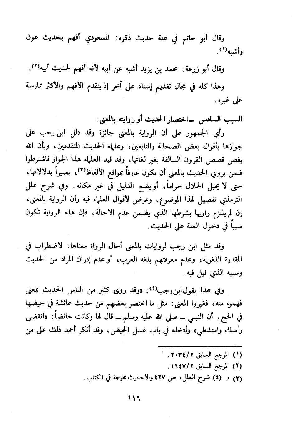 رأى الجمهور على أن الرواية بالمعنى جائزة وقد دلل ابن رجب على جوازها بأقوال بعض الصحابة والتابعين، وعلماء الحديث المتقدمين، وبأن الله يقص قصص القرون السالفة بغير لغاتها، وقد قيد العلماء هذا الجواز فاشترطوا فيمن يروي الحديث بالمعنى أن يكون عارفا بمواقع الألفاظ، بصيرا بدلالاتها، حتى لا يحيل الحلال حراما، أو يضع الدليل في غير مكانه. وفي شرح علل الترمذي تفصيل لهذا الموضوع، وعرض لأقوال العلماء فيه وأن الرواية بالمعنى، إن لم يلتزم راويها بشرطها الذي يضمن عدم الإحالة، فإن هذه الرواية تكون سببا في دخول العلة على الحديث.