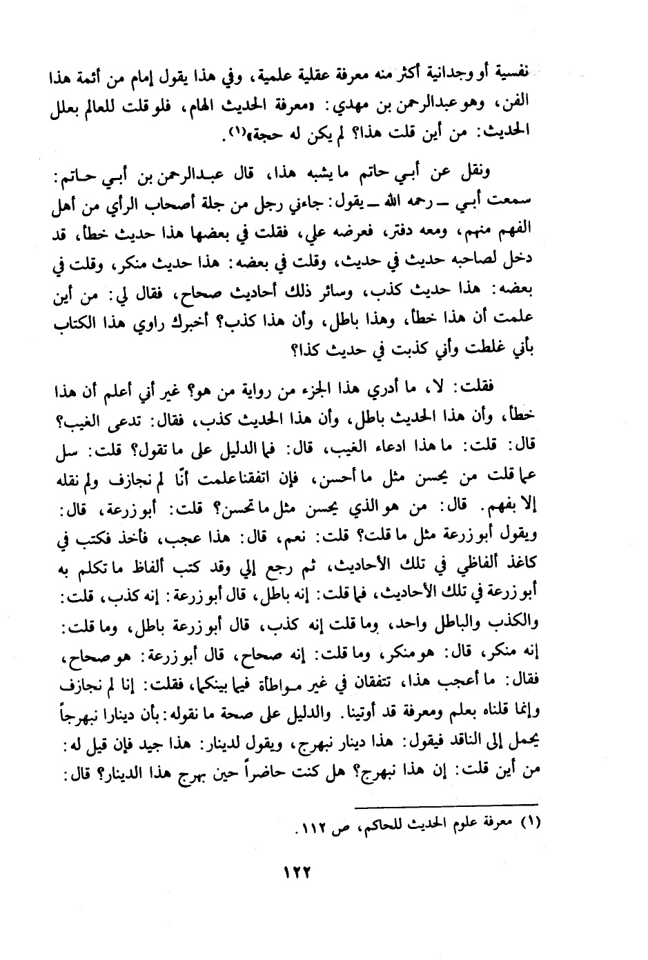 فقلت: لا، ما أدري هذا الجزء من رواية من هو؟ غير أني أعلم أن هذا خطأ، وأن هذا الحديث باطل، وأن هذا الحديث كذب، فقال: تدعى الغيب؟ قال: قلت: ما هذا ادعاء الغيب، قال: فما الدليل على ما تقول؟ قلت: سل عما قلت من يحسن مثل ما أحسن، فإن اتفقنا علمت أنا لم نجازف ولم نقله إلا بفهم. قال: من هو الذي يحسن مثل ما تحسن؟ قلت: أبو زرعة، قال: ويقول أبو زرعة مثل ما قلت؟ قلت: نعم، قال: هذا عجب، فأخذ فكتب في كاغذ ألفاظي في تلك الأحاديث، ثم رجع إلي وقد كتب ألفاظ ما تكلم به أبو زرعة في تلك الأحاديث، فما قلت: إنه باطل، قال أبو زرعة: إنه كذب، قلت: والكذب والباطل واحد، وما قلت إنه كذب، قال أبو زرعة باطل، وما قلت: إنه منكر، قال: هو منكر، وما قلت: إنه صحاح، قال أبو زرعة: هو صحاح، فقال: ما أعجب هذا، تتفقان في غير مواطأة فيما بينكما، فقلت: إنا لم نجازف وإنما قلنا بعلم ومعرفة قد أوتينا. والدليل على صحة ما نقوله: بأن دينارا نبهرجا يحمل إلى الناقد فيقول: هذا دينار نبهرج، ويقول لدينار: هذا جيد فإن قيل له: من أين قلت: إن هذا نبهرج؟ هل كنت حاضرا حين بهرج هذا الدينار؟ قال: