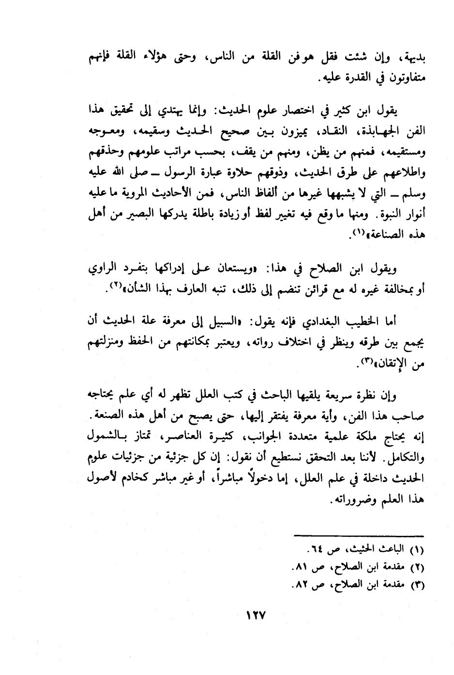 وإن نظرة سريعة يلقيها الباحث في كتب العلل تظهر له أي علم يحتاجه صاحب هذا الفن، وأية معرفة يفتقر إليها، حتى يصبح من أهل هذه الصنعة. إنه يحتاج ملكة علمية متعددة الجوانب، كثيرة العناصر، تمتاز بالشمول والتكامل. لأننا بعد التحقق نستطيع أن نقول: إن كل جزئية من جزيئات علوم الحديث داخلة في علم العلل، إما دخولا مباشرا، أو غير مباشر كخادم لأصول هذا العلم وضروراته.