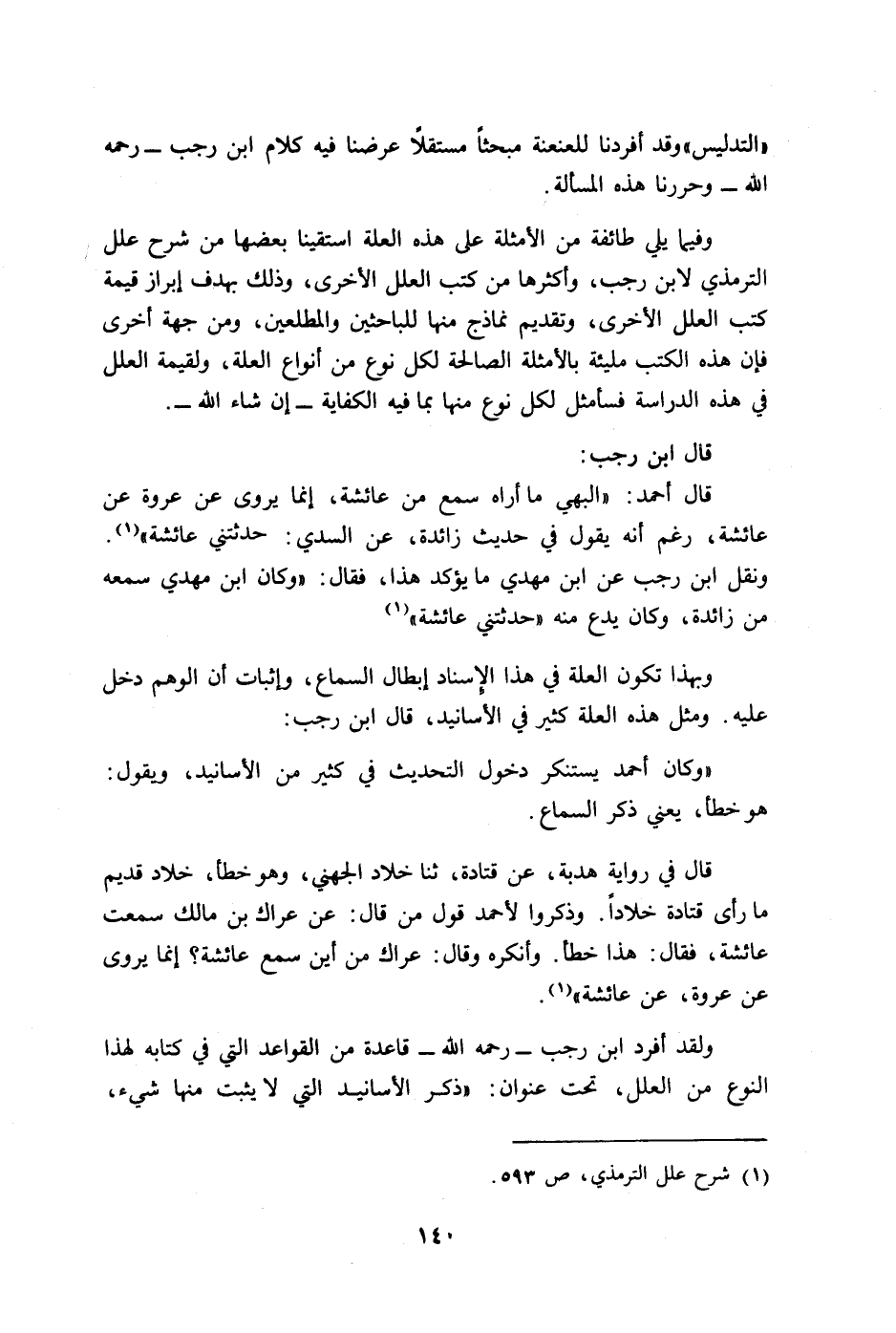 "التدليس" وقد أفردنا للعنعنة مبحثا مستقلا عرضنا فيه كلام ابن رجب - C - وحررنا هذه المسألة.