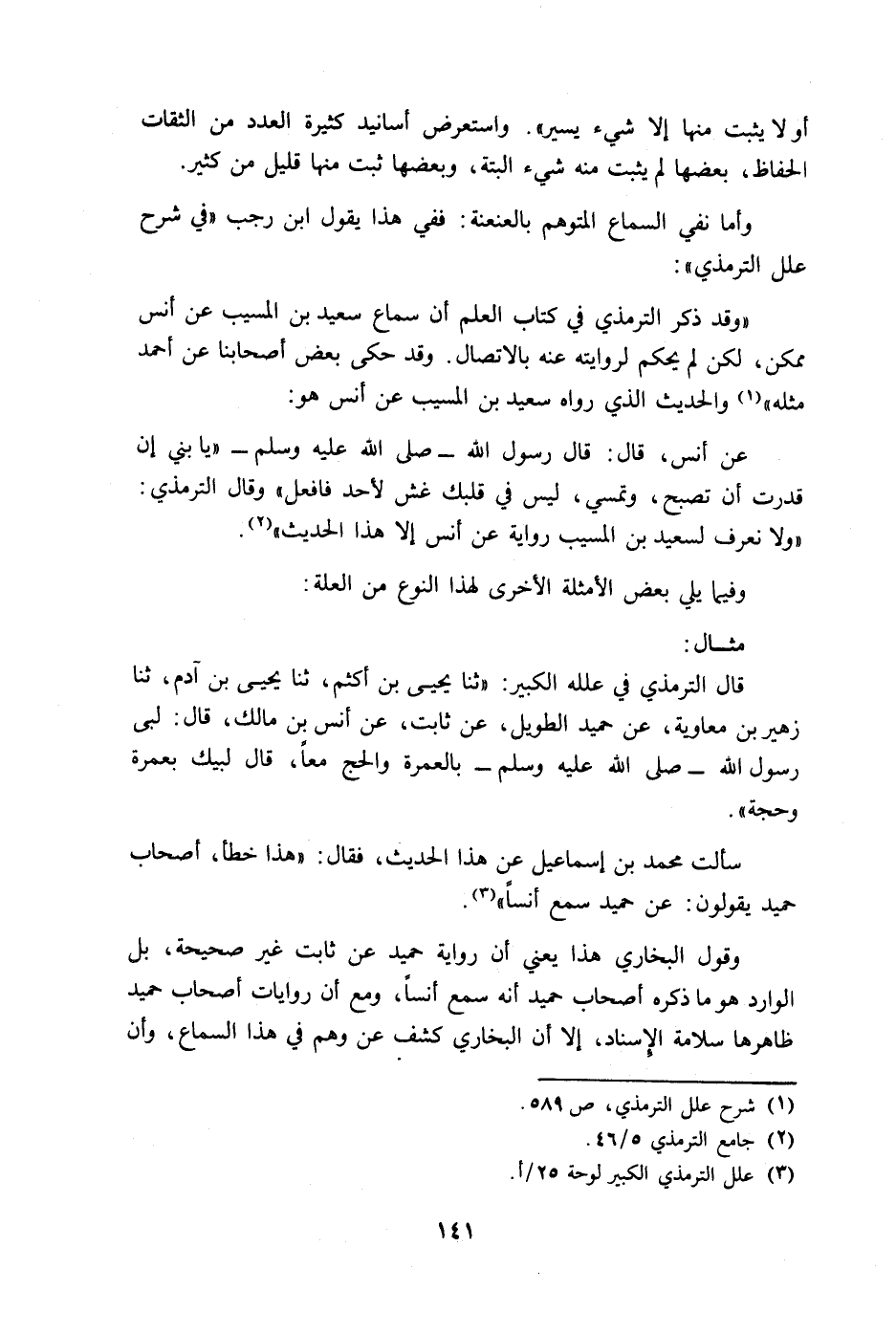 "وقد ذكر الترمذي في كتاب العلم أن سماع سعيد بن المسيب عن أنس ممكن، لكن لم يحكم لروايته عنه بالاتصال. وقد حكى بعض أصحابنا عن أحمد مثله" والحديث الذي رواه سعيد بن المسيب عن أنس هو: