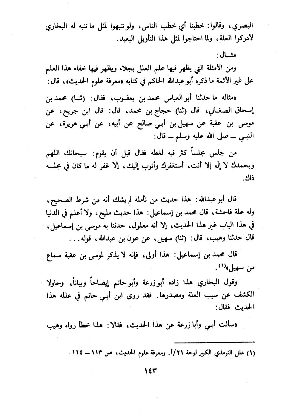 "مثاله ما حدثنا أبو العباس محمد بن يعقوب، فقال: (ثنا) محمد بن إسحاق الصغاني، قال (ثنا) حجاج بن محمد، قال، قال ابن جريح، عن موسى بن عقبة عن سهيل بن أبي صالح عن أبيه، عن أبي هريرة، عن النبي A قال: