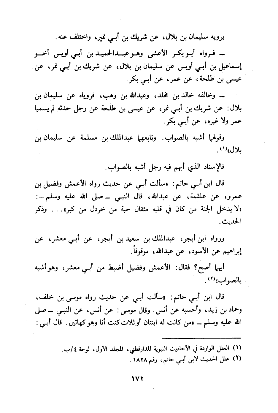 قال ابن أبي حاتم: "سالت أبي عن حديث رواه الأعمش وفضيل بن عمرو، عن علقمة، عن عبد الله، قال النبي A: "لا يدخل الجنة من كان في قلبه مثقال حبة من خردل من كبر" ... وذكر الحديث.