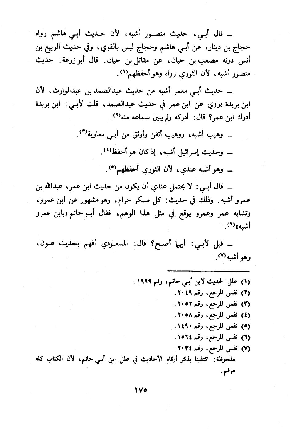 - قال أبي: لا يحتمل عندي أن يكون من حديث ابن عمر، عبد الله بن عمرو أشبه. وذلك في حديث: كل مسكر حرام، وهو مشهور عن ابن عمرو، وتشابه عمر وعمرو يوقع في مثل هذا الوهم، فقال أبوا حاتم "بابن عمرو أِشبه".