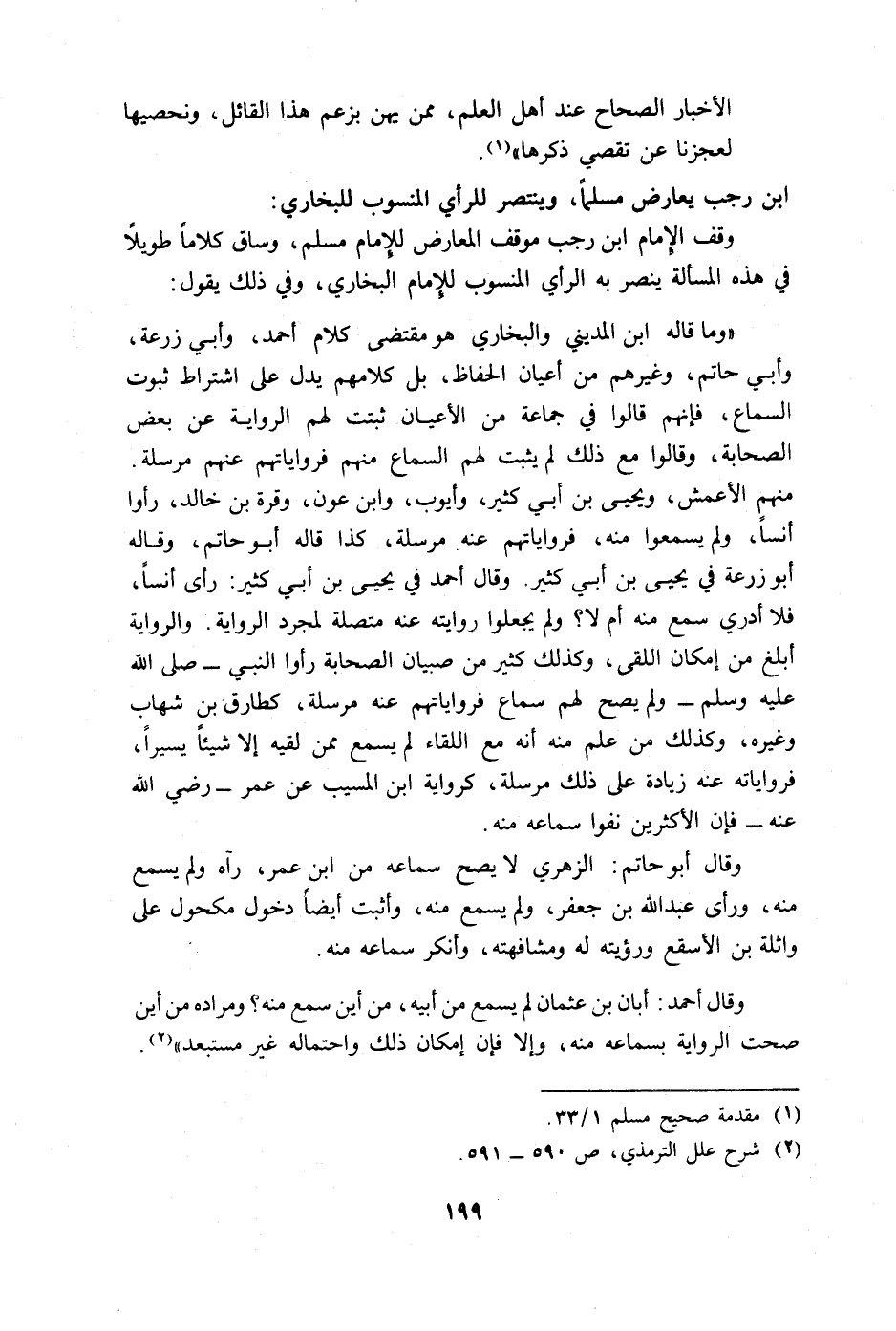 "وما قاله ابن المديني والبخاري هو مقتضى كلام أحمد، وأبي زرعة، وأبي حاتم، وغيرهم من أعيان الحفاظ، بل كلامهم يدل على اشتراط ثبوت السماع، فإنهم قالوا في جماعة من الأعيان ثبتت لهم الرواية عن بعض الصحابة، وقالوا مع ذلك لم يثبت لهم السماع منهم فرواياتهم عنهم مرسلة. منهم الأعمش، ويحيى بن أبي كثير، وأيوب، وابن عون، وقرة بن خالد، رأوا أنسا، ولم يسمعوا منه، فرواياتهم عنه مرسلة، كذا قاله أبو حاتم، وقاله أبو زرعة في يحيى بن أبي كثير. وقال أحمد في يحيى بن أبي كثير: رأى أنسا، فلا أدري سمع منه أم لا؟ ولم يجعلوا روايته عنه متصلة لمجرد الرواية. والرواية أبلغ من إمكان اللقى، وكذلك كثير من صبيان الصحابة رأوا النبي A ولم يصح لهم سماع فرواياتهم عنه مرسلة، كطارق بن شهاب وغيره، وكذلك من علم منه أنه مع اللقاء لم يسمع ممن لقيه إلا شيئا يسيرا، فرواياته عنه زيادة على ذلك مرسلة، كرواية ابن المسيب عن عمر - Bهـ - فإن الأكثرين نفوا سماعه منه.