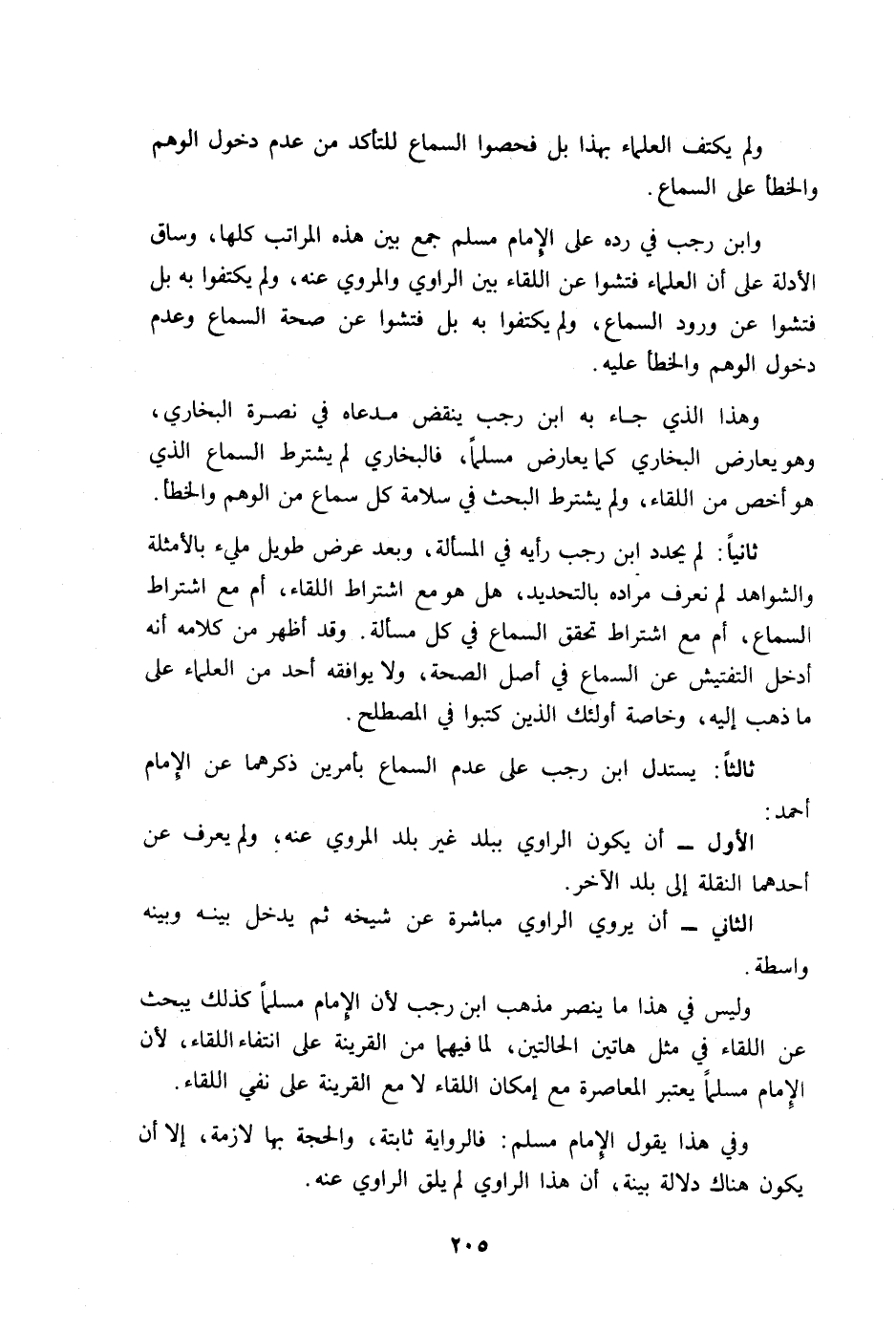 وابن رجب في رده على الإمام مسلم جمع بين هذه المراتب كلها، وساق الأدلة على أن العلماء فتشوا عن اللقاء بين الراوي والمروي عنه، ولم يكتفوا به بل فتشوا عن ورود السماع، ولم يكتفوا به بل فتشوا عن صحة السماع وعدم دخول الوهم والخطأ عليه.