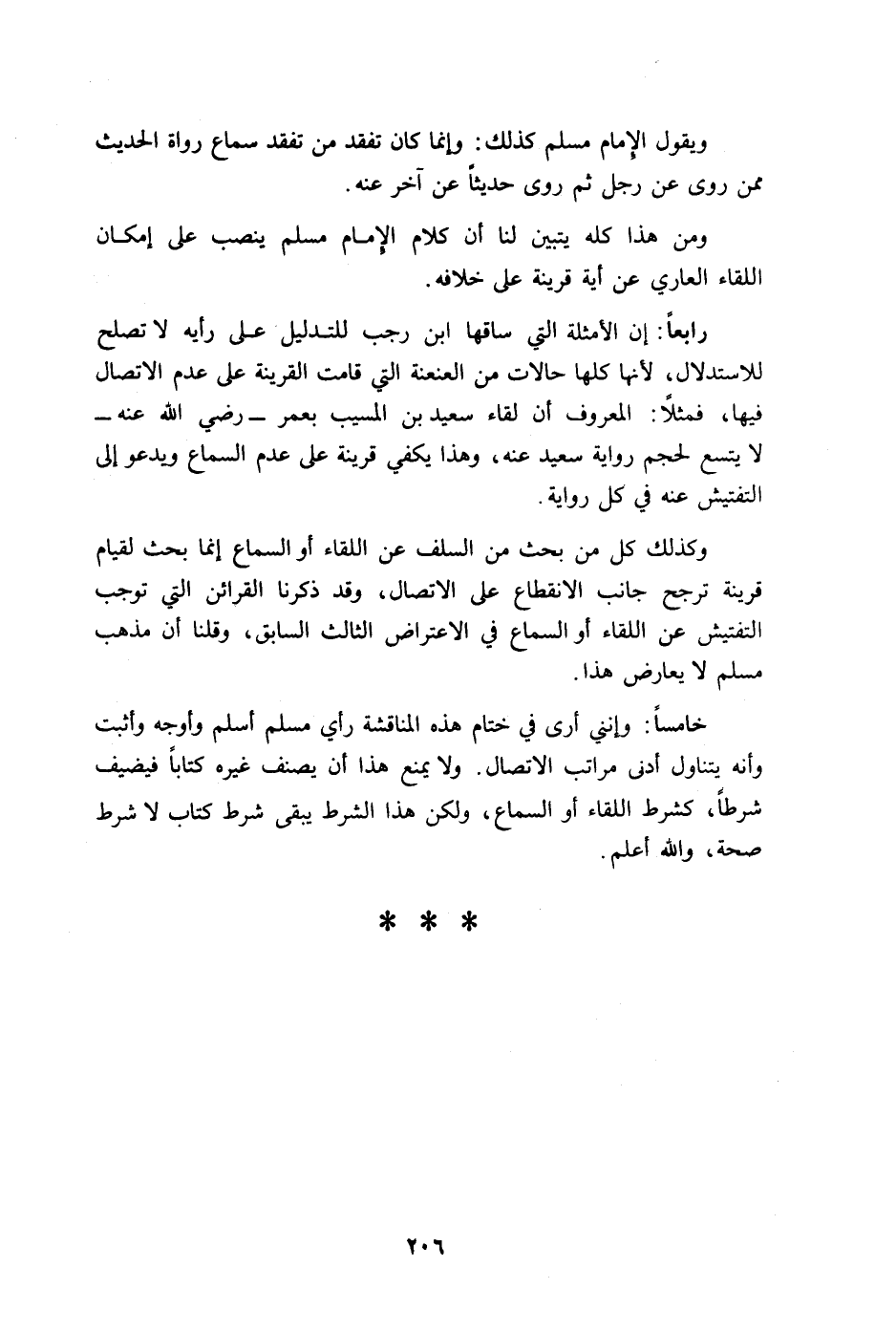 خامسا: وإنني أرى في ختام هذه المناقشة رأي مسلم أسلم وأوجه وأثبت وأنه يتناول أدنى مراتب الاتصال. ولا يمنع هذا أن يصنف غيره كتابا فيضيف شرطا، كشرط اللقاء أو السماع ولكن هذا الشرط يبقى شرط كتاب لا شرط صحة والله أعلم
