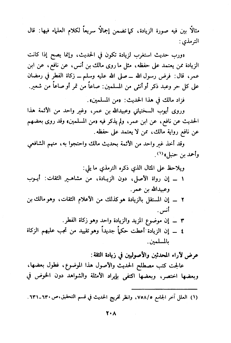 "ورب حديث استغرب لزيادة تكون في الحديث، وإنما يصح إذا كانت الزيادة ممن يعتمد على حفظه، مثل ما روى مالك بن أنس، عن نافع، عن ابن عمر، قال: فرض رسول الله A زكاة الفطر في رمضان على كل حر وعبد ذكر أو أنثى من المسلمين: صاعا من تمر أو صاعا من شعير.