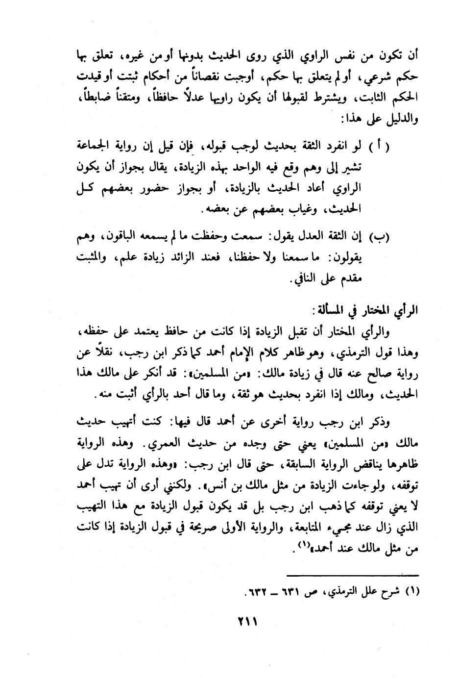 والرأي المختار أن تقبل الزيادة إذا كانت من حافظ يعتمد على حفظه، وهذا قول الترمذي، وهو ظاهر كلام الإمام أحمد كما ذكر ابن رجب، نقلا عن رواية صالح عنه قال في زيادة مالك: "من المسلمين": قد أنكر على مالك هذا الحديث، ومالك إذا انفرد بحديث هو ثقة، وما قال أحد بالرأي أثبت منه.